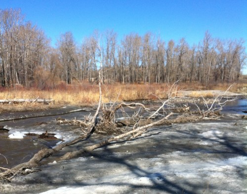 This creek is not very deep, but it’s pretty fast and COLD right now, so we’re certainly not slogging through it like we do in the summer. It will be interesting to watch the spring floods arrive, though. 🙂