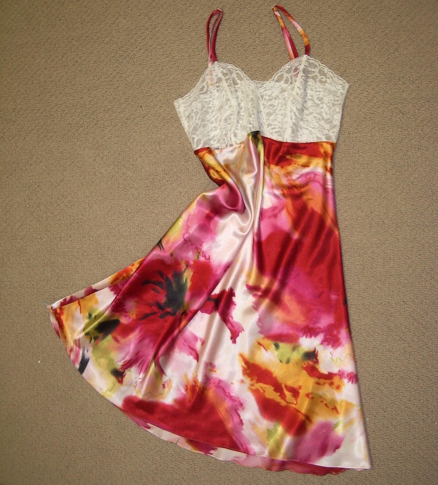 So, in the end, I settled. Despite being 100% polyester, this fabric feels just as nice as the above-mentioned silk (seriously, with my eyes closed I couldn’t tell the difference), and was a fraction of the price. Not that I was going for cheap here, for once. And while the print isn’t quite what I envisioned, it is very her. I think. Oona should be proud—I have such a hard time wrapping my head around prints. The lace is the same thrift-store stuff as my blue slip—as I said, I haven’t found anything nicer.