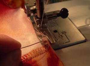 My first “breakthrough” in the use of the rolled-hem foot came while making a tiered skirt for tribal bellydance. I’ve been meaning to do a post about these skirts for ages, but haven’t gotten around to it. I used the hemmer foot to hem the five zillion miles (ok, actually only about 25 yards) of the bottom tier. This is actually an AWESOME way to gain skill (or something vaguely approximating it) with this attachment, because it’s lots of practice and after the first yard or two you really stop caring. And the edges are perfectly straight and ripped, which is relatively easy to maneuver (although the ripped threads may stick out). The only tricky part (as usual) is going over the seams, and like I said, after the first few, you really stop caring.