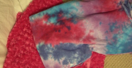 There’s this crazy dye-splotch flannel, originally purchased for making little zip-pouches and rice-bags for school presents. Hmm. But I think I had convinced Syo that it would be an acceptable backing for her crazy pink fun-fur, part of which she made into a pillow, the rest of which is supposed to become a blankie. This is what happens when you have to buy remnants and the second one is free…
