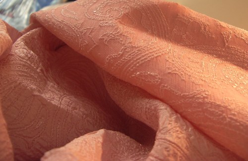 But this fabric landed in my stash the other week, and while I doubt I’ll sew it up any time soon (barring a sudden onslaught of cocktail parties), it’s just screaming to be made into the ultimate little pink dress. The colour in real life is a pale baby pink, not quite what either image is showing, but maybe closer to the top one. It’s the oddest embroidered poly satin; it’s like it’s backed with a thin knit web that gives the embroidery an almost quilted look from (what I presume is) the right side. The embroidery pattern is paisley. I love paisley. This is yet another example of how I go nuts for texture.