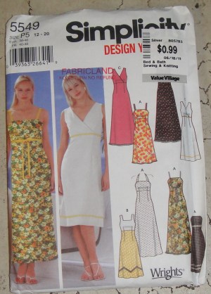 I’m not quite sure what pattern in stash might be suitable for adapting into this. The bodice of view A from Simplicity 5549 might work, but the skirt is too A-line. The skirt from 6750 has more of the right shape, but has more seams than I think I want.