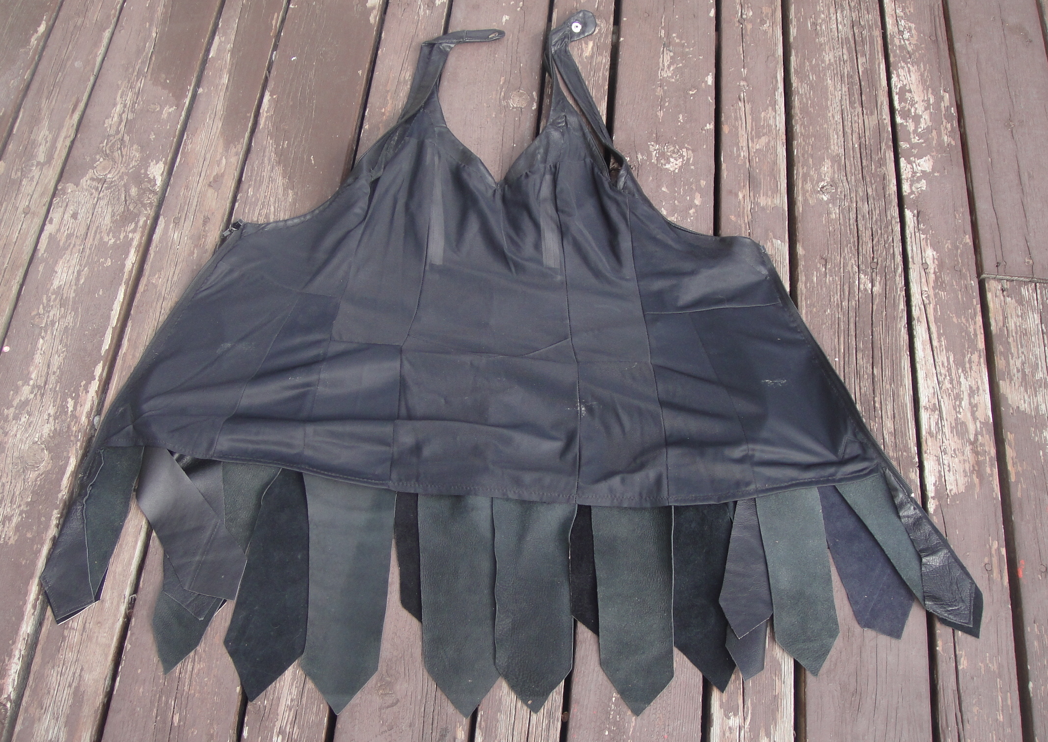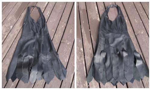 That is so awesome! It totally brought memories flooding back to me of my best friend’s home made Xena outfit; she took repurposed bits of leather from other items and fashioned them together into a VERY accurate costume, complete with hand applied studs, and papier-mache breastplate handpainted coppery gold for effect!! Despite the fact I was not a fan of the show, I was VERY impressed with her creativity… yours seems to be hardware and armour-free, so it may just very well be a super cool leather dress! ^___^