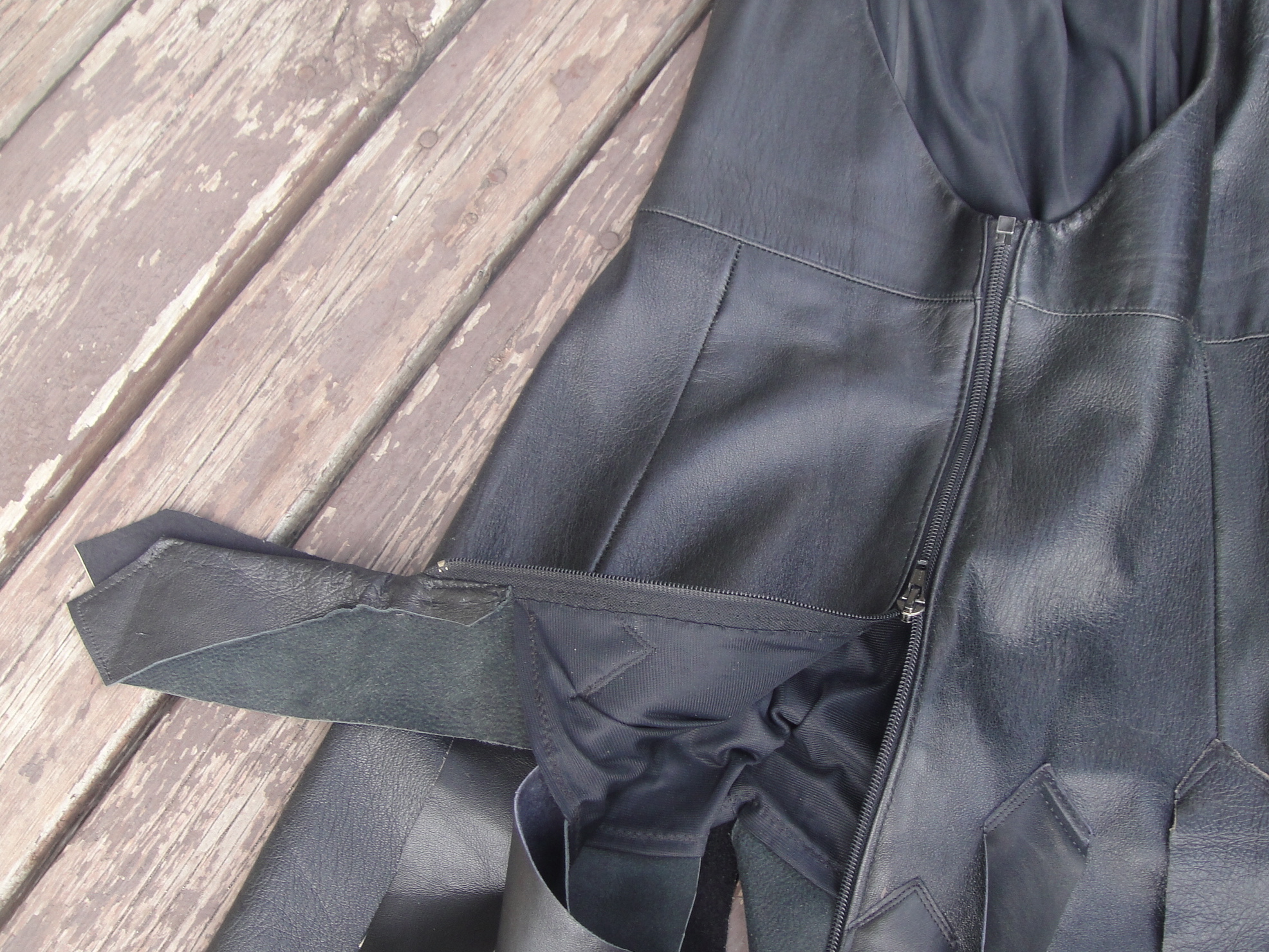 The entire dress zips open at the back with a separating zipper that, oddly, opens from the bottom. Was this planned, or did our seamstress mess up and then decide to keep it since, well, unpicking leather? I can’t say it makes the dress any easier to get into, although it’s certainly quick to get out of. Hmm. Is that another point for the fetish-gear argument?