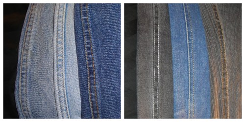 Shrinking. Because, like a good little sewist, I pre-shrink my fabric and then construct my pants, whereas commercial jeans, from what I understand, are shrunk after construction. (Can you imagine trying to launder huge industrial rolls of denim?) So that characteristic ripple is probably the result of post-stitching shrinkage. Which is why my jeans have comparatively little ripple (and if I was really good and pre-washed my denim multiple times, as is often recommended, they probably wouldn’t have any ripple at all), and even brand-new dark-washes from the store, like the ones above on the right in the left picture above (how’s that for confusing), have a well-developed ripple.