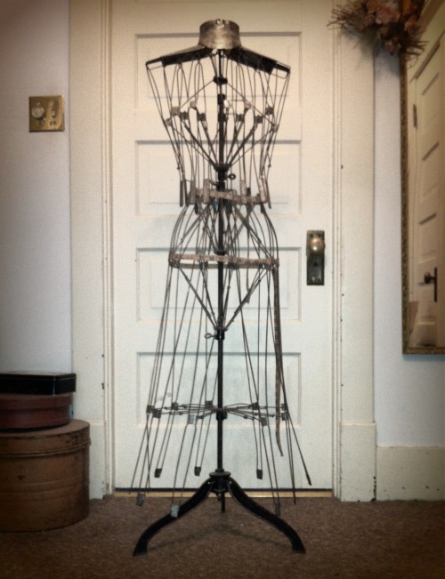 I say you keep sharing these fabulous sewing-related antiques! That is such a unique dressform, and it totally makes sense when you think about having to fit dresses over petticoats and such. It does look kind of like a bizarre torture instrument, though…
