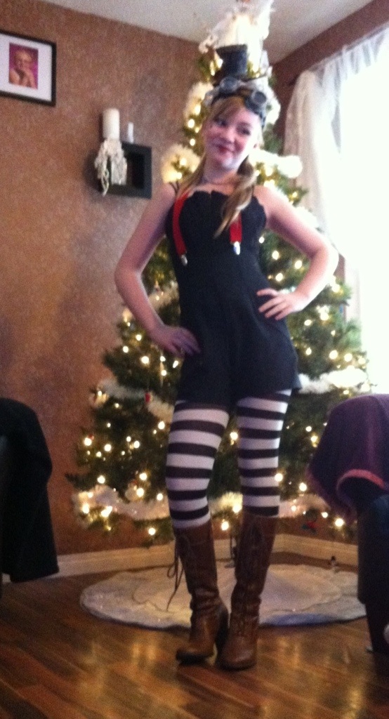 What a darling costume! I love those goggles. Interesting that the younguns are going for the high waist!