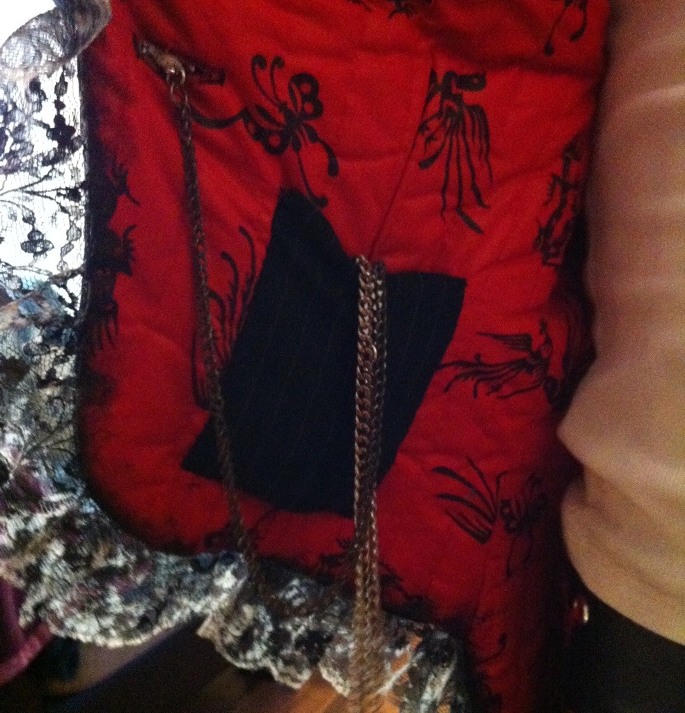 My mom offloaded generously gave us a bag of old stenciling supplies a week or two before Hallowe’en, including a lovely, delicate rose stencil. I couldn’t resist adding it to the coats in a couple of places. I just used the same acrylic paint I used on the rest of the coats. I don’t particularly expect a lot from this down the road, but it served the purpose at the time.