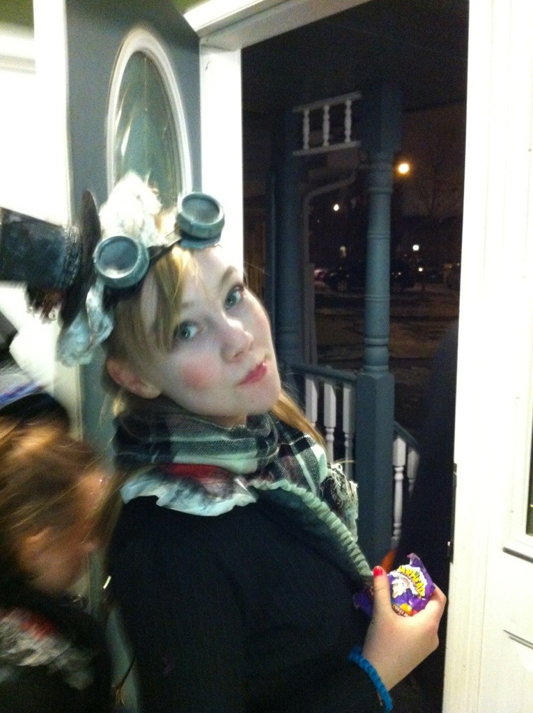 Anyway, I’d say the Steampunk costumes were a success, at least as costumes. As costumes for Hallowe’en in Saskatchewan… not so much. I think the last several years in balmy southern Alberta kind of messed with my head in the Hallowe’en-costume-planning department. Note To Tanit: Saskatchewan Hallowe’en costumes should be: showing NO skin, ideally can cover a snow suit. Scarves are a bonus.
