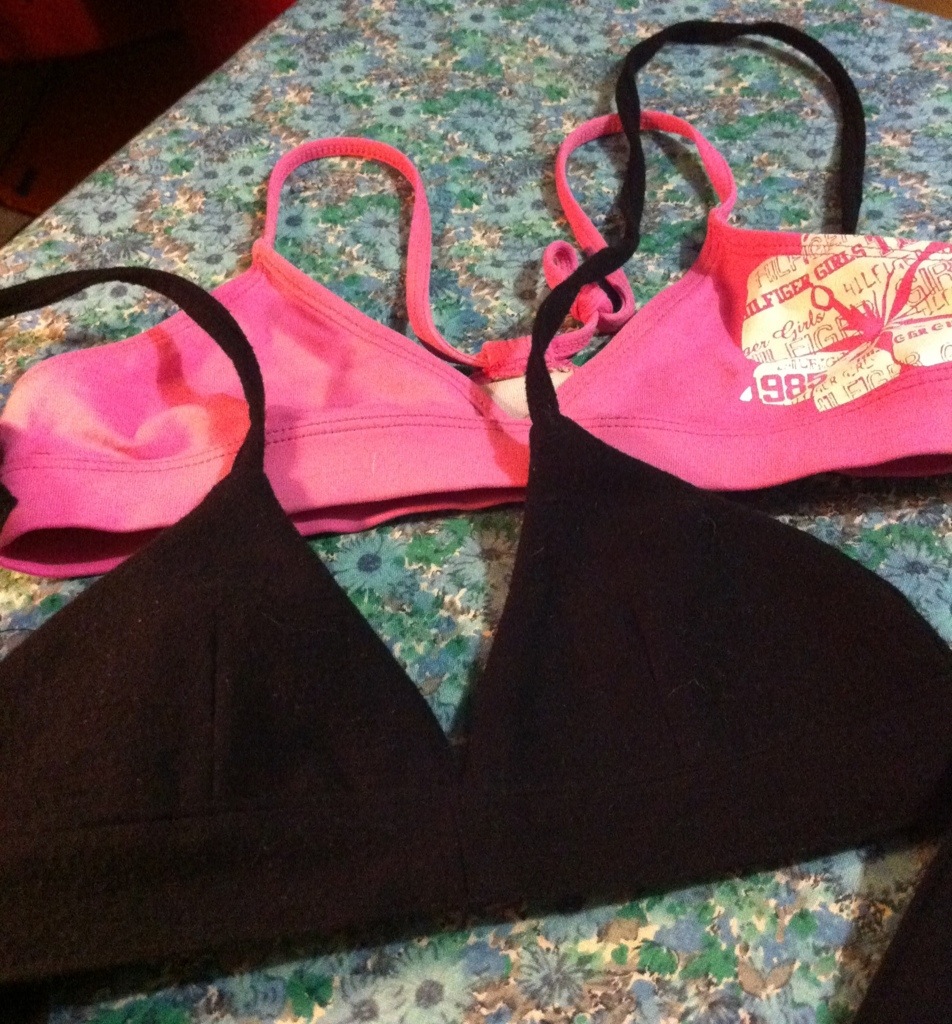 I copied the basic shape/scale from a bikini top she has, including a few accomodations. The triangles “slant” a bit towards the centre (to avoid gaping with the halter-ties). I added the world’s teensiest darts. And I interfaced one layer of fleece, and fusetaped the edges of the other, so none of that pesky diagonal stretching. Oh, I do love interfacing. It used to scare the bejeezus out of me, now I can’t live without it.