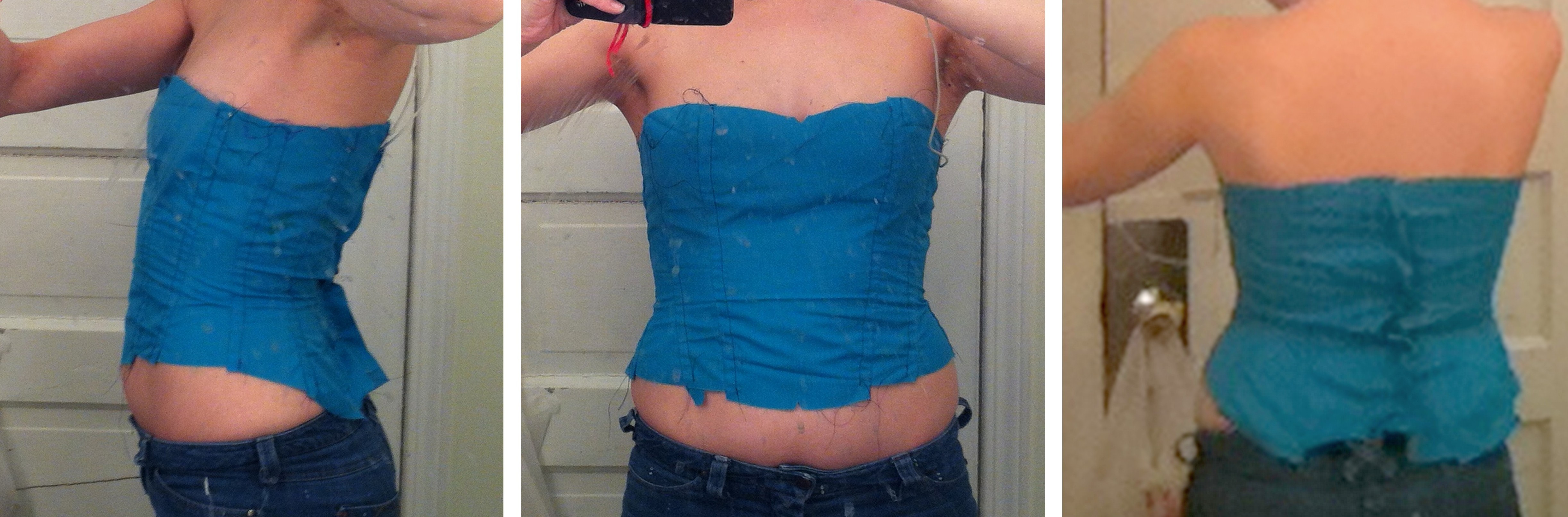 Anyway, about that mockup. Will you ever forgive me for these horrible dirty-bathroom-mirror fitting photos? I may never forgive myself. Especially the back photos, which I took with the reverse camera on the iPhone, which has crappy resolution and no flash. Anyway, so, bust fit seems ok (recall that since the top and bottom of the corset are bound, there’s no seam allowances to fold under there). Waist fit as well—it’s tighter, but it’s supposed to be, right? It’s just below the waist everything goes, um… yikes. Ok, so obviously my hips are not appropriately Victoriany. But the biggest thing, really, is that weird length thing from front to back. The corset, from the illo, Β is supposed to arc up over the hips, and down in front and back. Well, I have the back bit just fine, but the front? WTF? So, obviously I will be lengthening the bottom of the front. Like, a couple of inches.