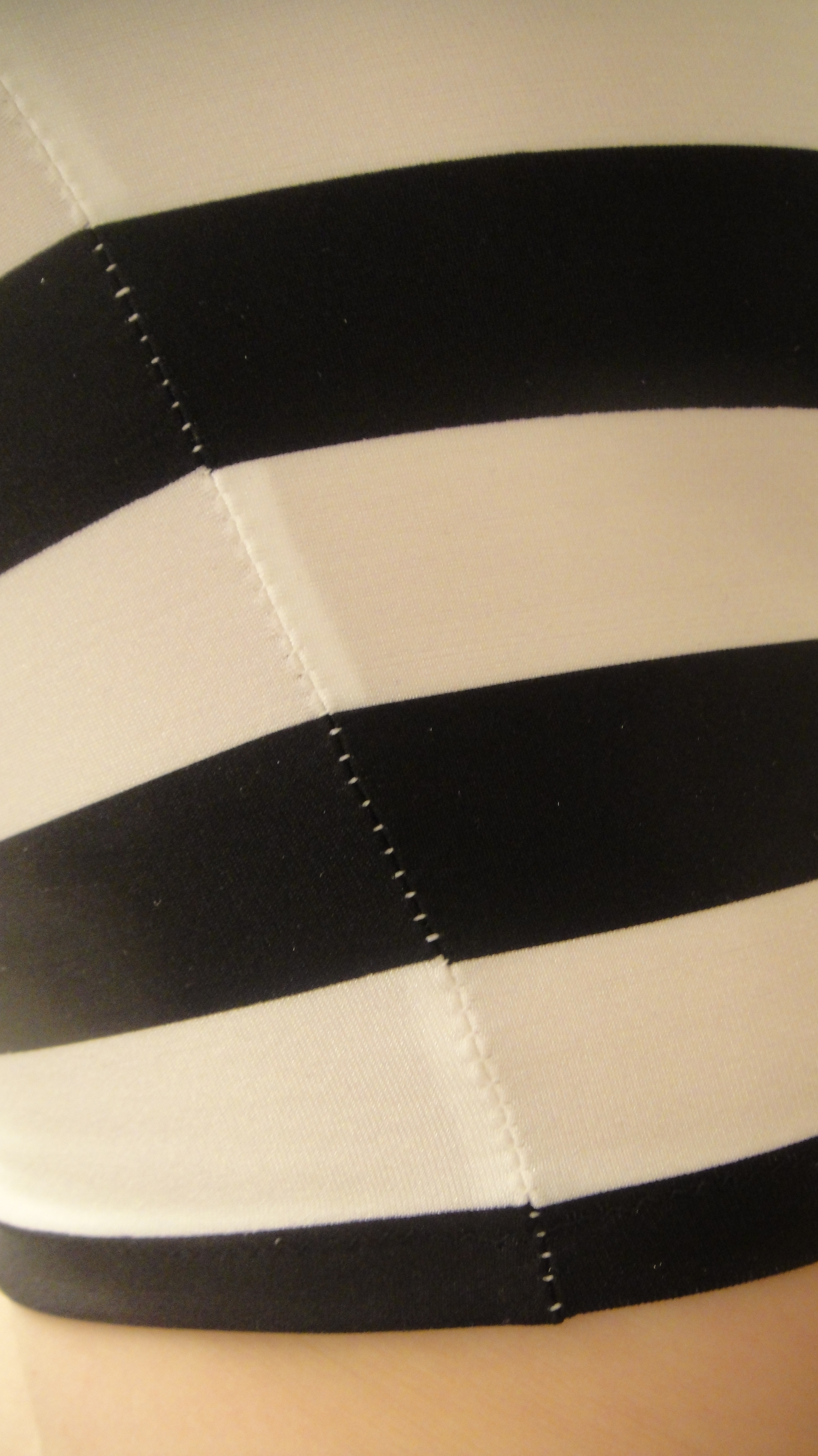So this morning we went for breakfast with some old friends, and afterwards the female half of said friends (who is also sewy, although she’s been at it hardcore far longer than I) and I abandoned both spouses and all children and made for the wilds of the East Side Value Village. It was a fun trip, and got a trunkful of excess stuff out of my house, and I came home with a small but pleasant haul: a few patterns, some really cute and surprisingly comfy shoes that are totally not my usual colour scheme (my mom will be jealous, though, or rather she won’t because it would take far more than one pair of shoes to compete with her fabulous Collection.) The fabric section was mostly disappointing, but there was one, tantalizingly tiny piece of gorgeous black and white striped spandex—barely half a metre, for a $0.99.