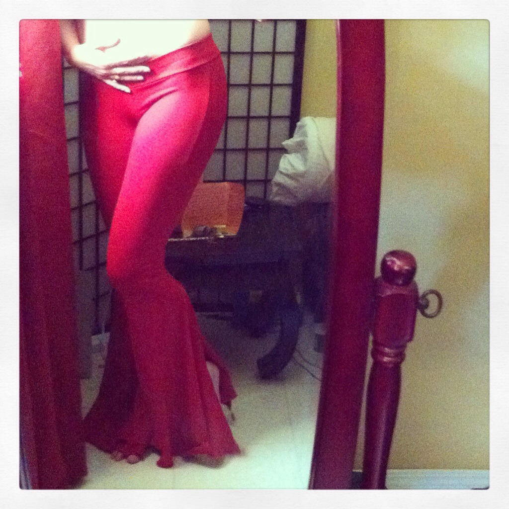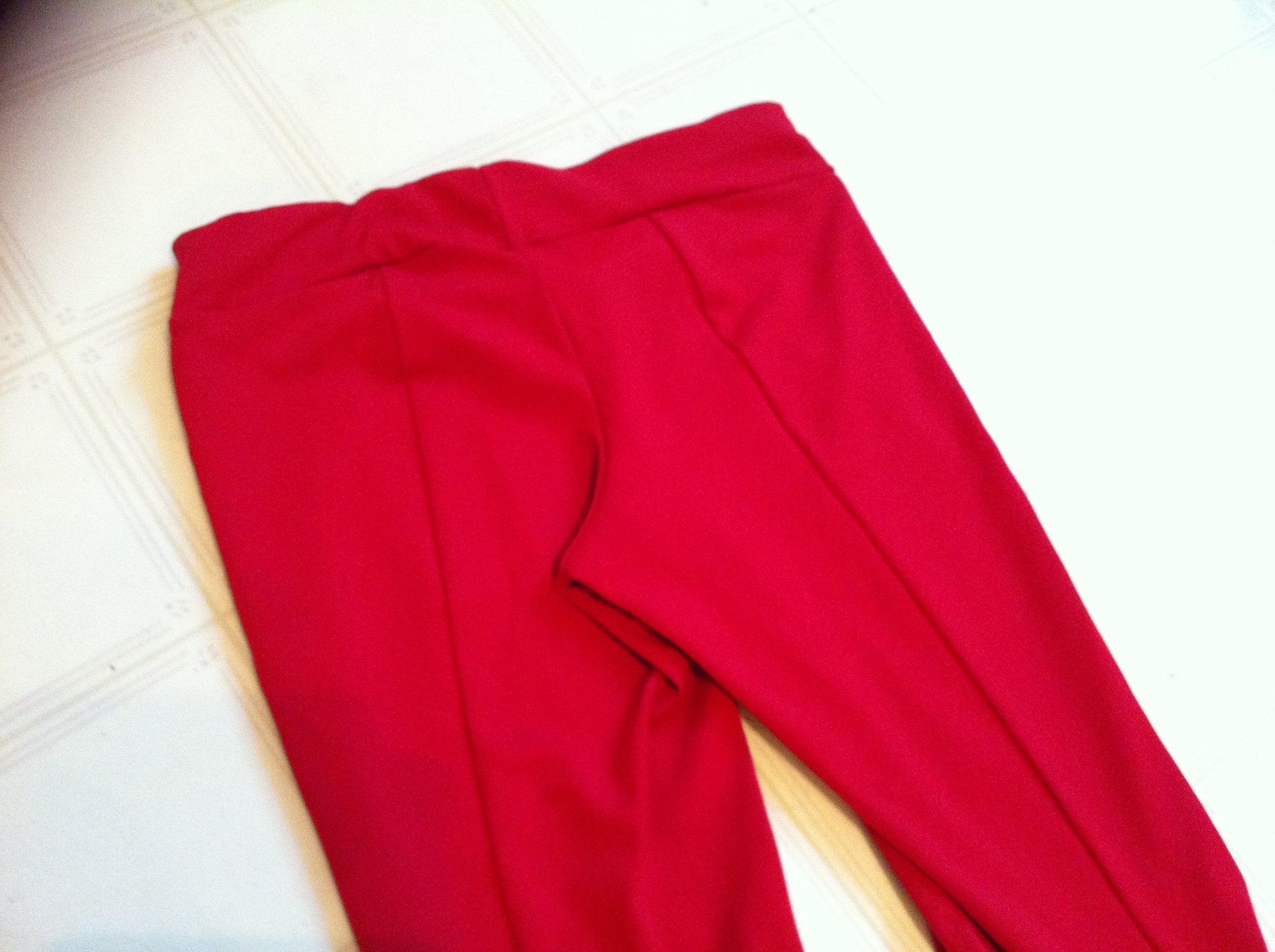 My fabric of choice here is red supplex, a wicking fabric that Fabricland used to carry, long and long ago. I found a single languishing bolt at my local store, and managed to follow it along through the mark-downs until it was finally at a price I could afford, and nabbed the last three metres. These took about two and a half, which tells you everything you need to know about how much fabric those flares eat up. Nom nom nom.
