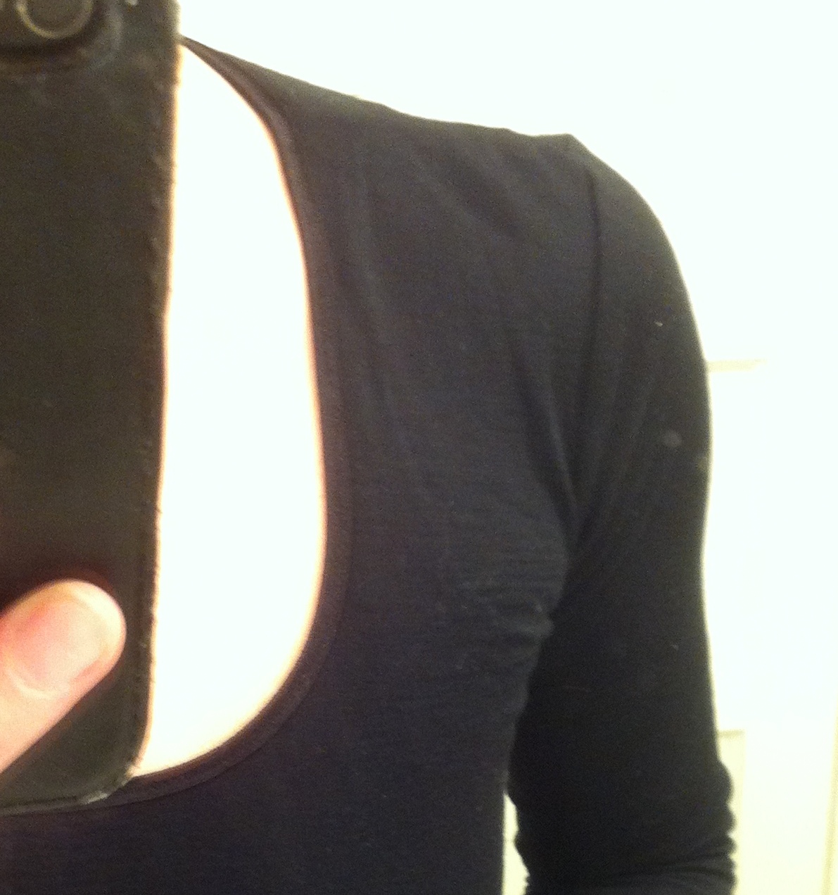 I am happy to report, it makes a pretty damn yummy shirt. The merino isn’t as soft as cotton or rayon to touch, but it ain’t bad either. At least, I don’t find it itchy, though I’m not particularly sensitive to such things anyway. I added a band to the hem, because I love that finish, and I used 1/4″ fold-over elastic to finish the neckline.