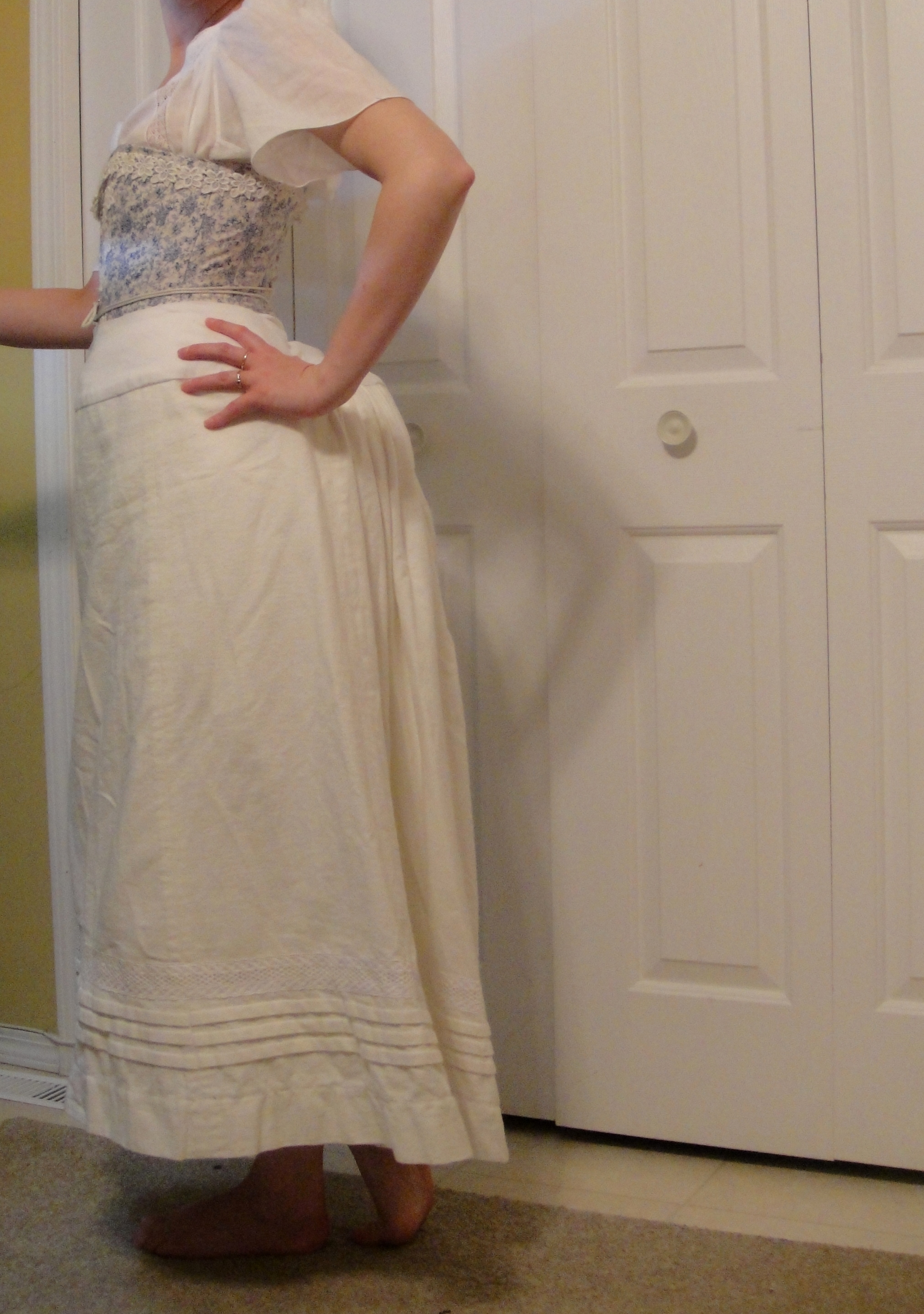 I put the front of the petticoat onto the yoke smoothly (no gathering), relying on the back gathering to get everything to fit. I kinda really like this method of skirt fitting. One of these days I will work on those crazy Victorian gathering techniques that all seem to involve making multiple lines of perfectly-even stitches and then stroking each of the resulting pleats to maximum perfection before meticulously stitching each one down. For now, though, I just gathered.
