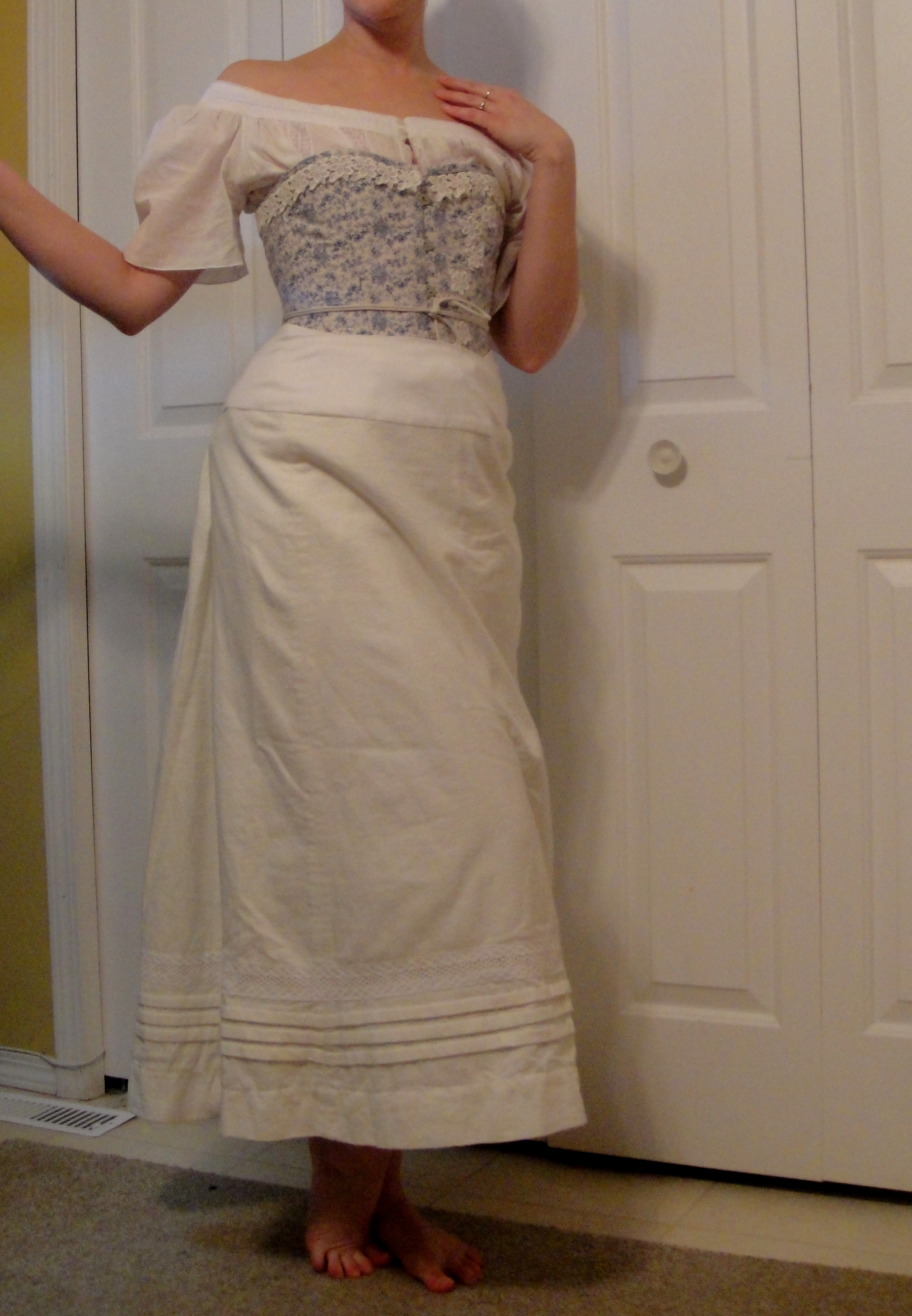 Anyway, this petticoat is based pretty much entirely on the instructions in The Home Needle, (p. 37-38). She is mostly describing a regular muslin petticoat (Er, “white skirt,”), but does give a nod to flannel petticoats: