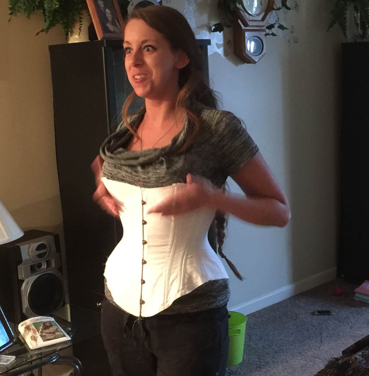 I think the size is much better this time around—still roomy in hips and bust (arguably the bust is a little too roomy but I really don’t want compression in this region š ), with a smidge (or more than a smidge) more waist definition than before. And a perfectly reasonable, roughly parrallel lacing gap. By the way, I get a whole 2″ of waist compression out of this thing (unlike the other one, which actually doesn’t change my waist measurement at all once you add in the bulk of the corset itself.) I think that’s pretty much my limit, barring serious waist-training that just isn’t going to happen. I wasn’t really expecting more—there isn’t a lot of space between my hips and ribcage to squish in, and I’m a pretty rectangular shape to start.