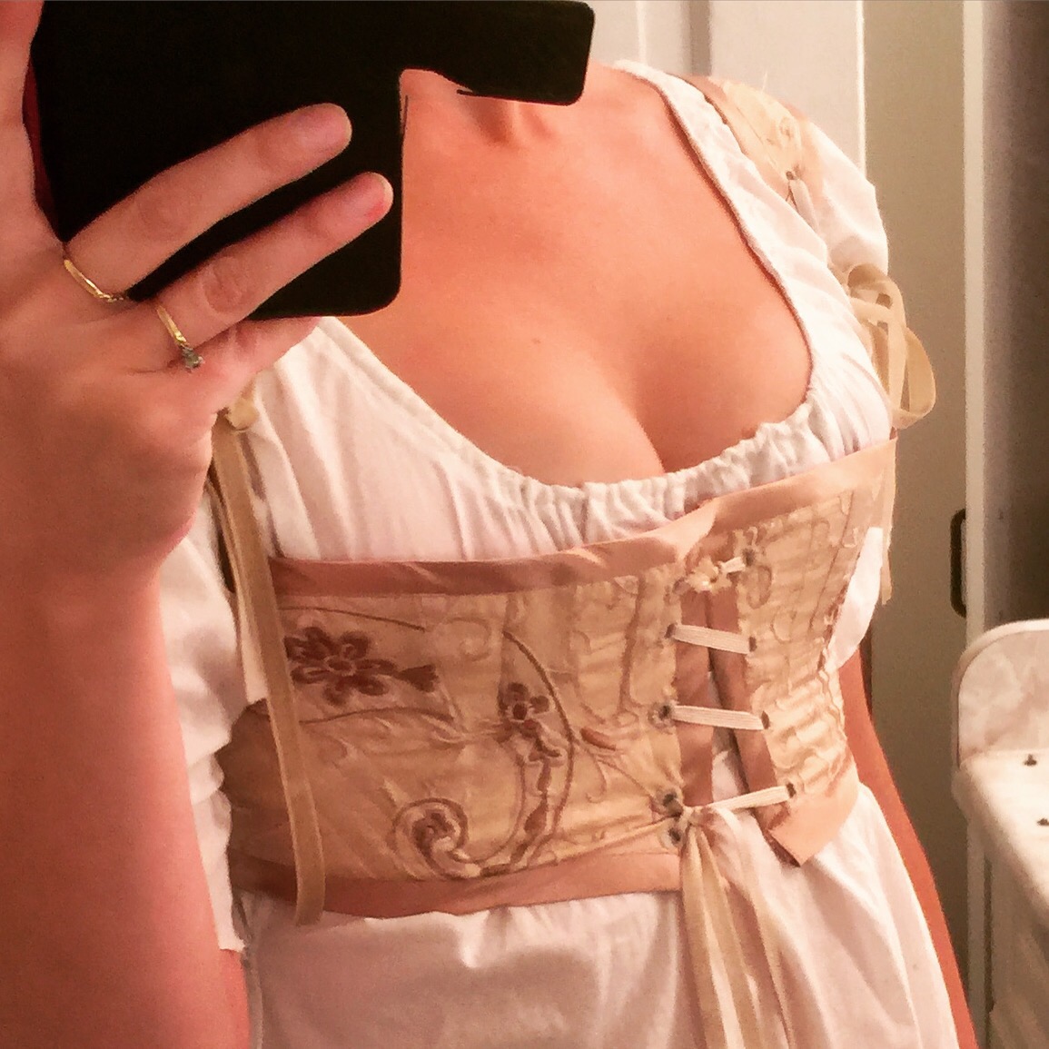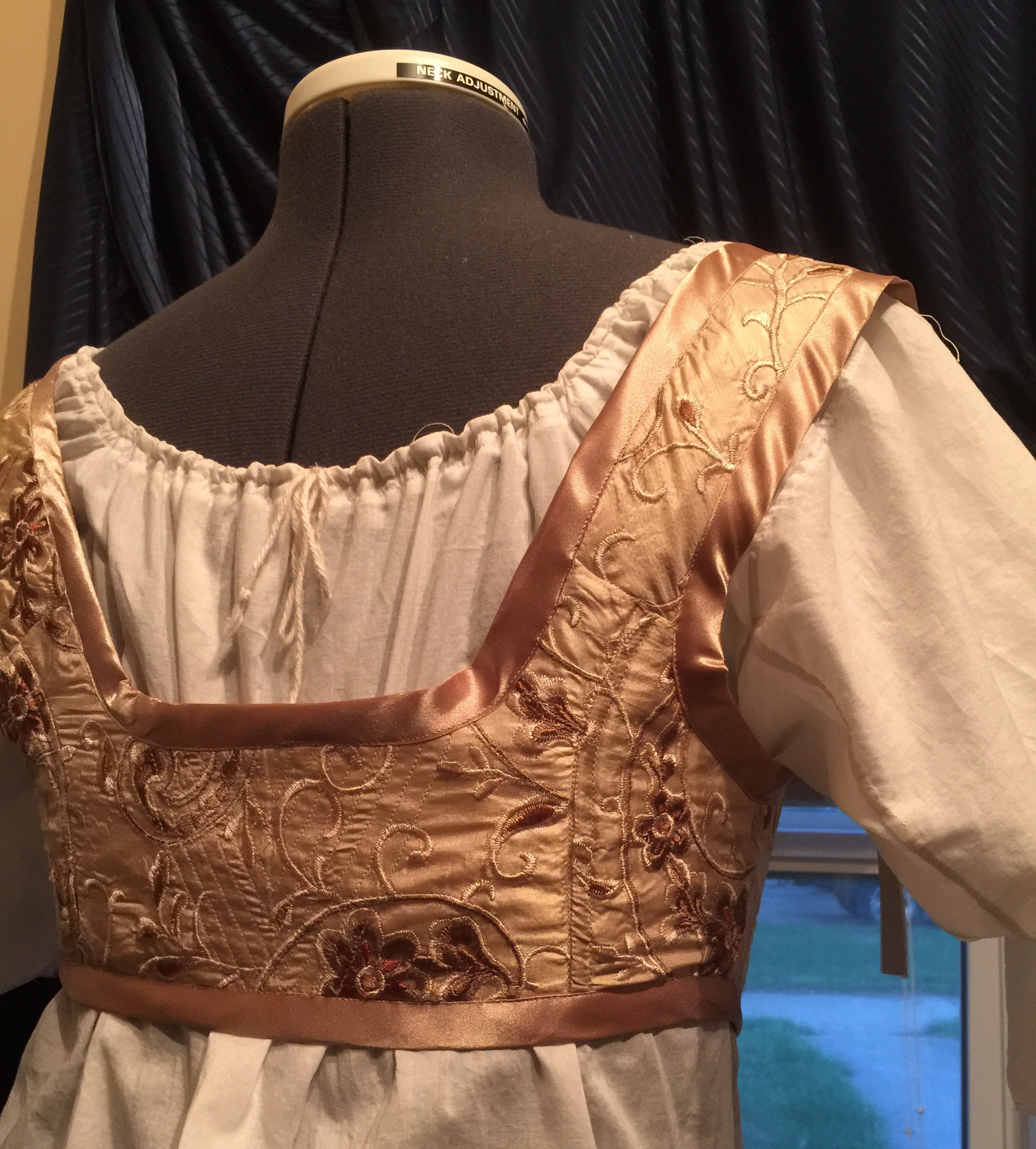 The only actual change I made to the pattern was to have the straps separate in the front and attach with ties. Not so much because I thought there was anything wrong with the pattern length but just in case, y’know. Plus I had this fabulous matching velvet ribbon. I think I set them a little further apart than the original pattern would call for—this isn’t inappropriate for the period but would probably be too wide for a lot of people (including my dress form.) They seem to stay fairy well on me, though—though I haven’t tested them under heavy movement yet.