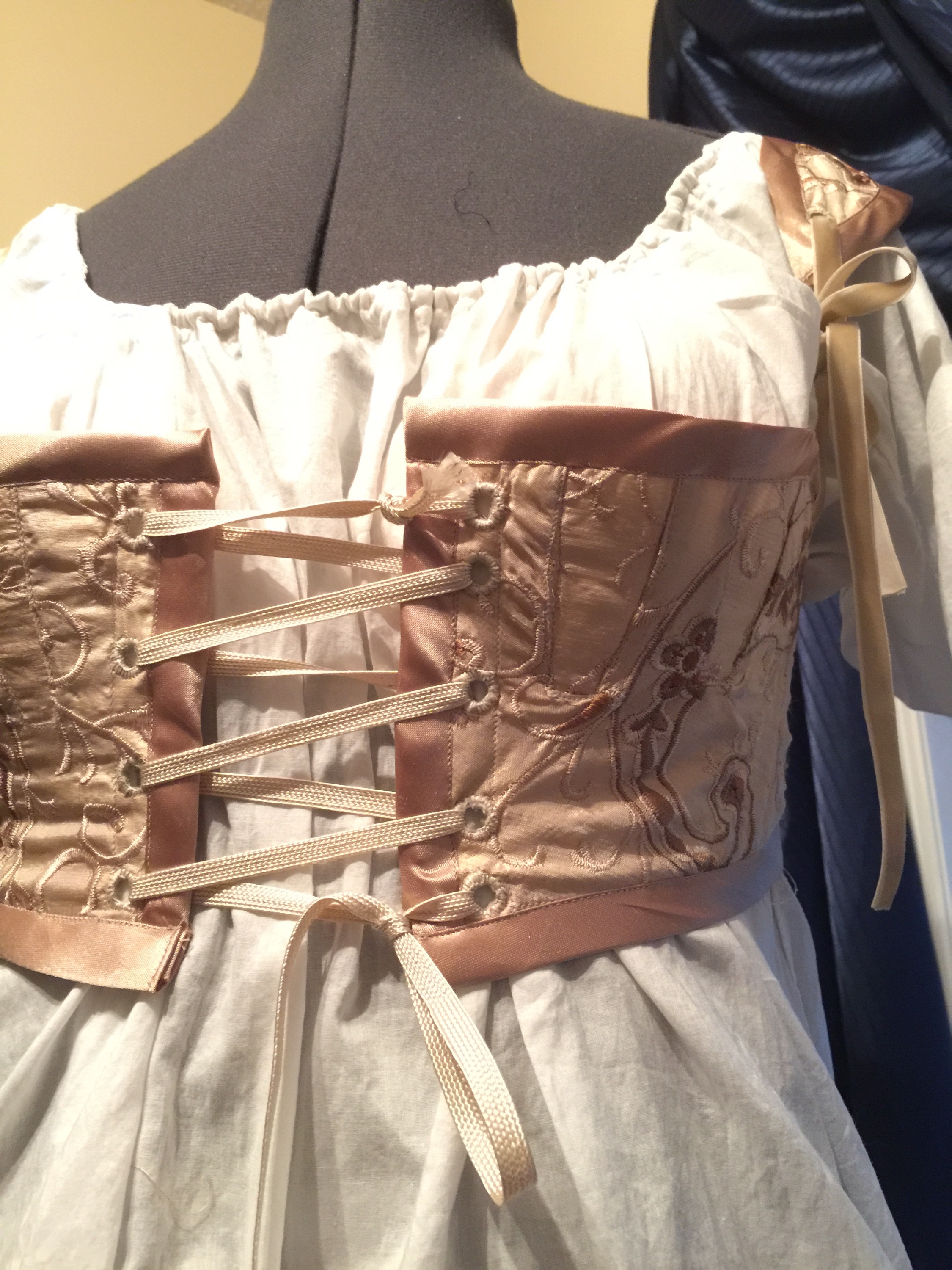 After studying my Pinterest boards, I opted for spiral lacing. Regency seems to be pretty much right around when the switch from spiral to crisscrossing lacing happened, but more of the extant garments and images seemed to me (in a very unscientific survey) to be spiral-laced. (Or have holes spaced for spiral lacing even if their laces are currently cross-laced.)