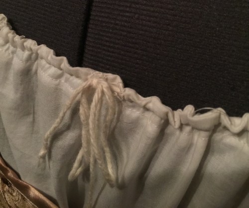I made hand-worked eyelets for the neckline drawstring to pass through. However, not being overly bright, I worked them in the BACK of the neckline. Oops. I’m not really happy with the neckline anyway (I did a fairly terrible job of applying the bias tape drawstring casing) and it seems a little high so when/if I get the time and inclination Imay redo it.