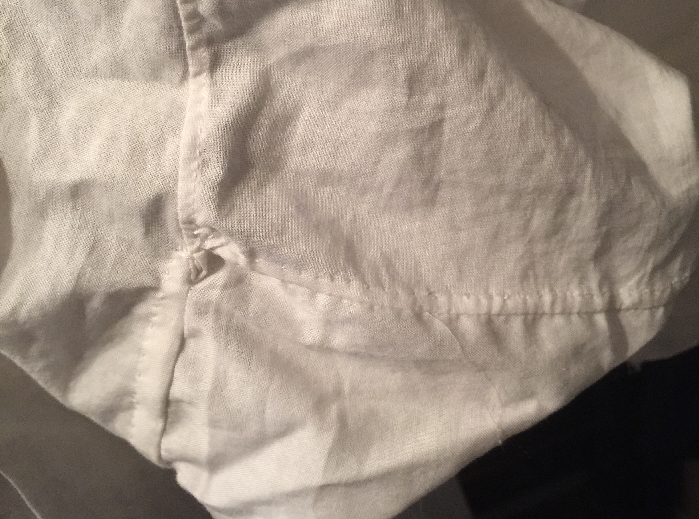 I did all the long seams flat-felled on my machine, but I can’t quite wrap my head around flat felling the gussets by machine, and I never do a very good job of matching things up so my seam allowances were, ah, wonky… So I felled those seams by hand. Hand-sewing: for fixing fuckups. 😉