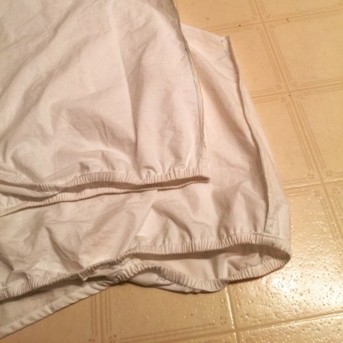 Blerg. That was boring. And I managed to sew one of the corners wrong-side out, so I french-seamed it because I’m much too lazy to rip stitches on a bedsheet. And now I wish I had French-seamed all of them, because it looks so much nicer. (Don’t ask me why I might ever care how the inside of my bedsheet looks.)