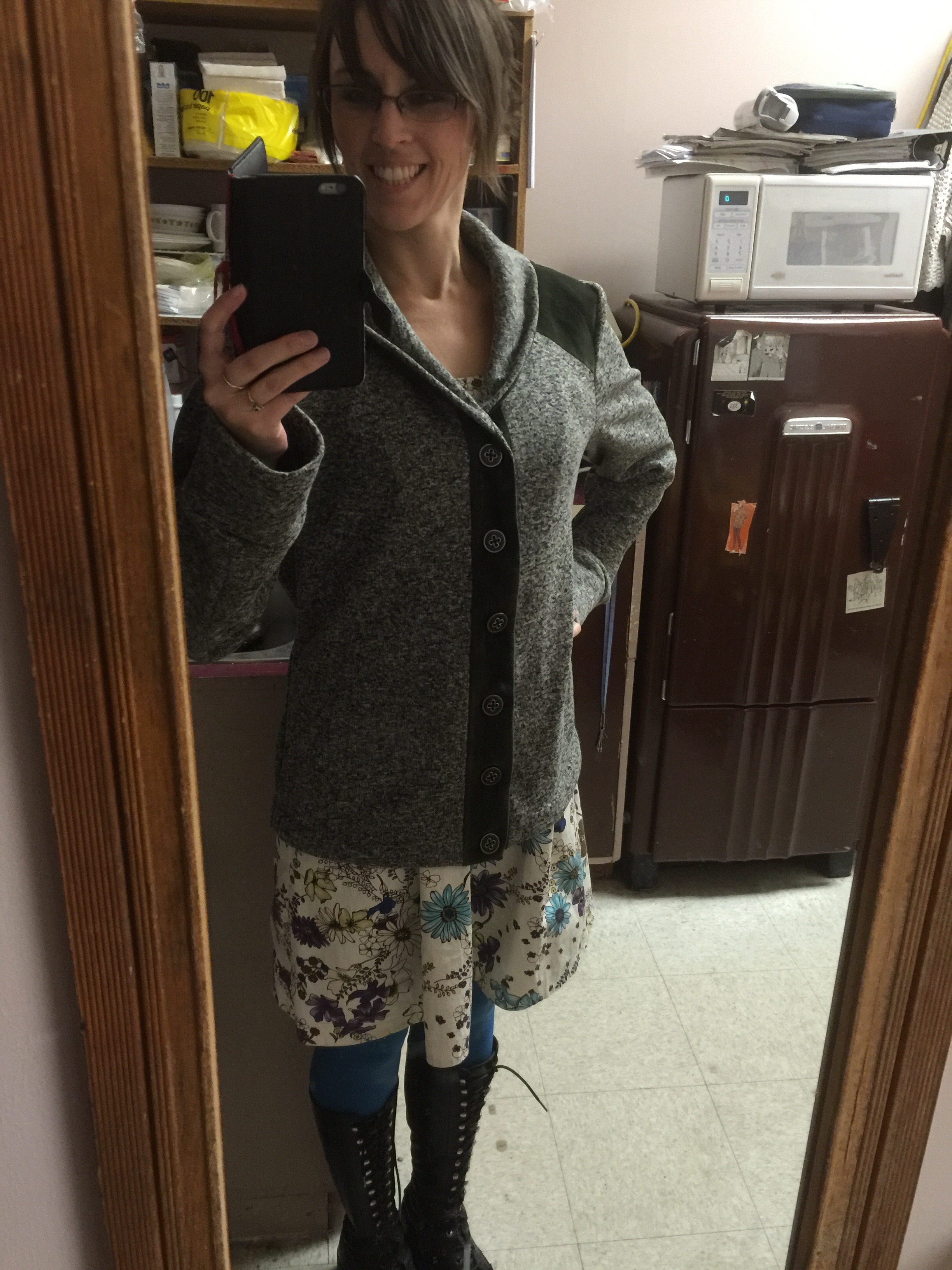 I love your ‘break room at work’ photo! Cause that’s what it looks like (tiny microwave perched on the old fridge), you got your hand on your hip and taking the photo with the other because hey, it’s a mirror! At work!