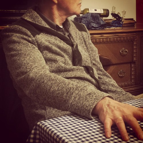 Well, I said before that this was a good fall for sweater knits* at my local Fabricland—one of them that came in was this gorgeous speckled thing that looks knitted on the outside but fleecy on the inside. A little bell went off inside my head that this was THE ONE. And just in time for my Dad’s 70th birthday, too.