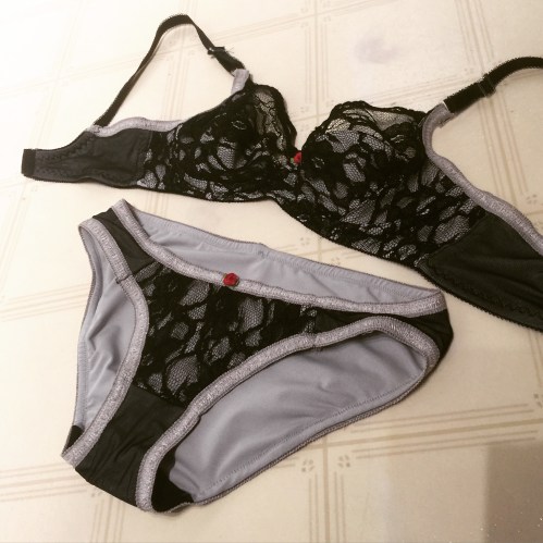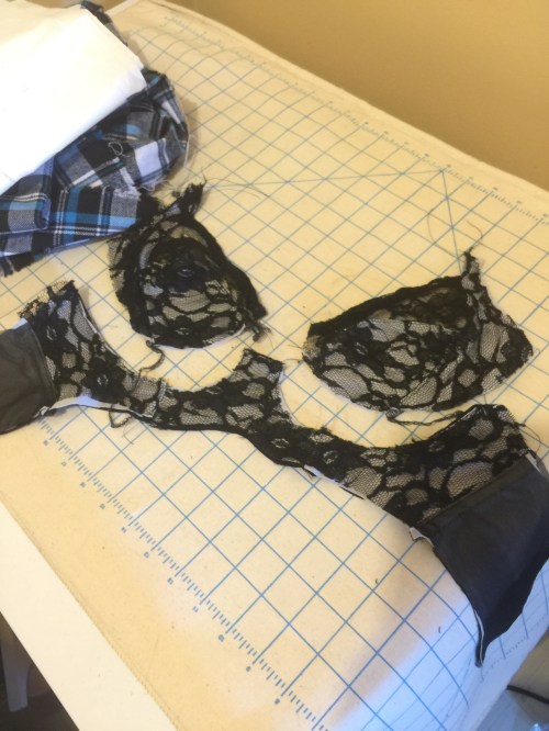 For this set I layered the stretch mesh and non-stretch lace over a thin grey poly spandex knit. I kinda wish the grey showed more, actually, and maybe that I had used mesh over the power bar rather than lace, so it would show more. And maybe stretch more.