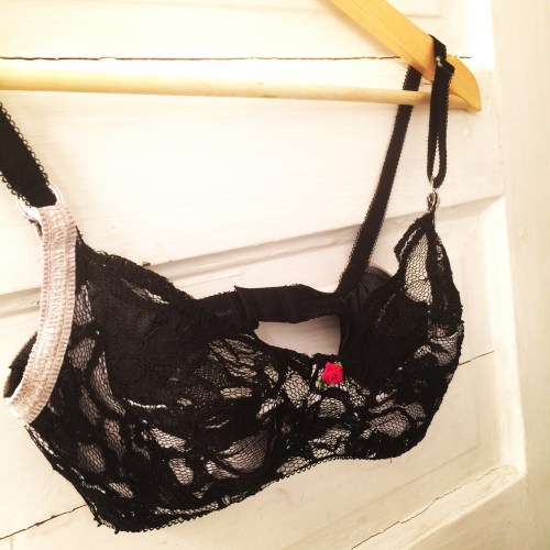 Because the biggest problem, again, is that the non-stretch lace is less forgiving than the stable-but-with-some-give earlier version. The power bar—the vertical piece at the side of the bra—actually kinda cuts in at the seam to the other pieces, not a nice look, though also not evident in the pictures, so it probably isn’t as bad as I think it is. And the shape is more pointed in the lace than it was in my scuba first version. Not a bad shape, but a little different.