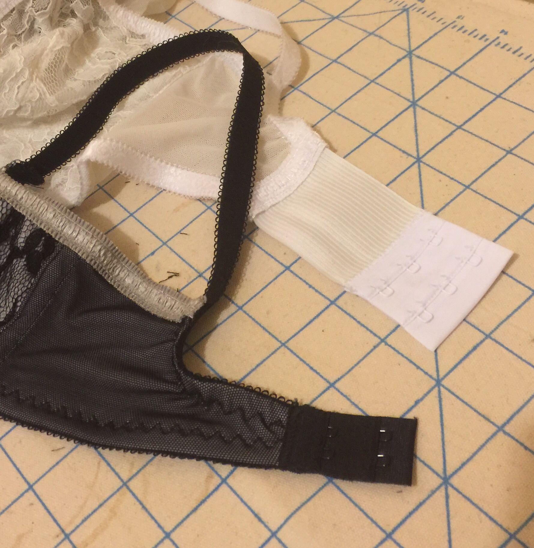 Fortunately (?) the bra backs Fabricland sells come with this weird chunk of elastic attached to one side, which I was able to use to extend the back. So it will go around, even if it’s a bit fugly.