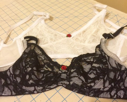 For my own information, I’m going to add that the underwire I’m using is about two sizes larger than the “right” underwire for this size. This means it’s wide enough not to cut in at the side of my breast, which is one of my biggest complaints with store bought bras. I also had to shorten them significantly on the cleavage side to fit this pattern, which is fine if you have the tools for that but less fine otherwise.