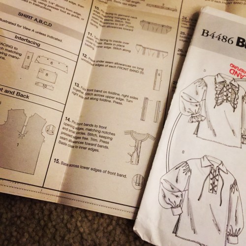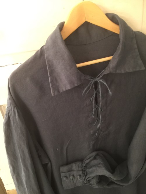 Needless to say, I was not a fan of the pattern. But I’m also a hoarder-in-training, so in stash it stayed. Until early this spring, when an old family friend contacted me, looking for a vaguely Mediaeval-looking shirt to wear for performances of a choir he’s part of that does Mediaeval and Renaissance style music.