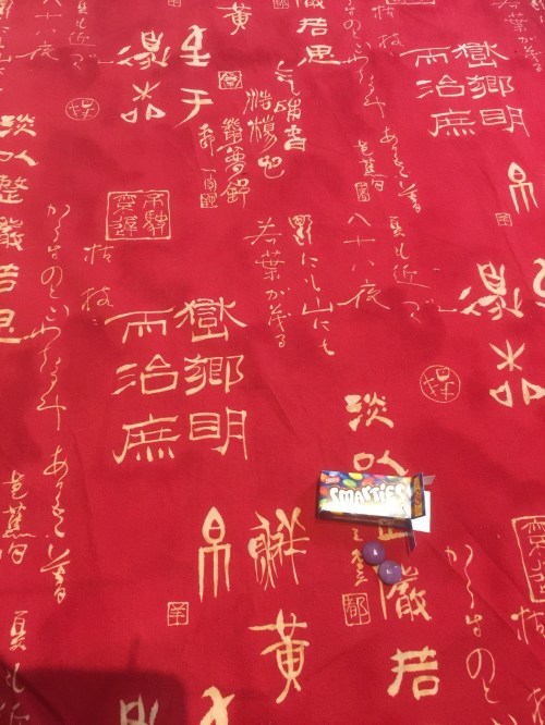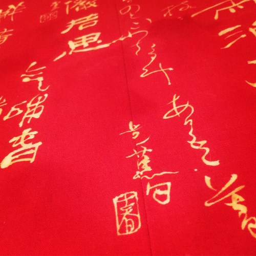 So, having selected fabric for a quick wearable muslin, I promptly spent hours agonizing over which way was up—heaven forbid I put my kanji upside down! (Never mind what it may or may not actually say… 😂) Google translate and similar sites did, in the end, convince me that the way I thought was up probably was, so I put on my big girl panties and went for it.