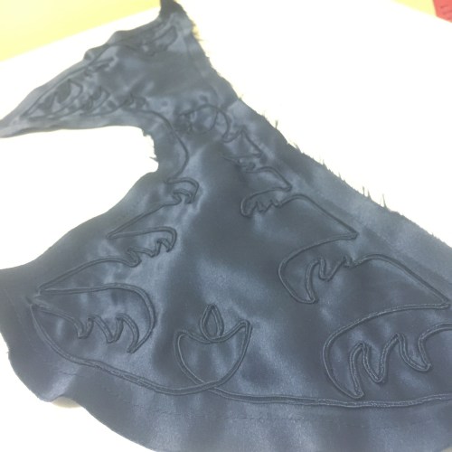 I couldn’t find a nice shiny dark blue brocade ANYTHING for the drapey collar, so after some brainstorming with my shop mates, I decided to try to make my own with soutache appliquéd onto a satin. Duchesse satin, actually, the heavy matte stuff. Not the best choices for a waterfall collar, I agree. But I do like the look. In hindsight a bemberg rayon might have done as well.