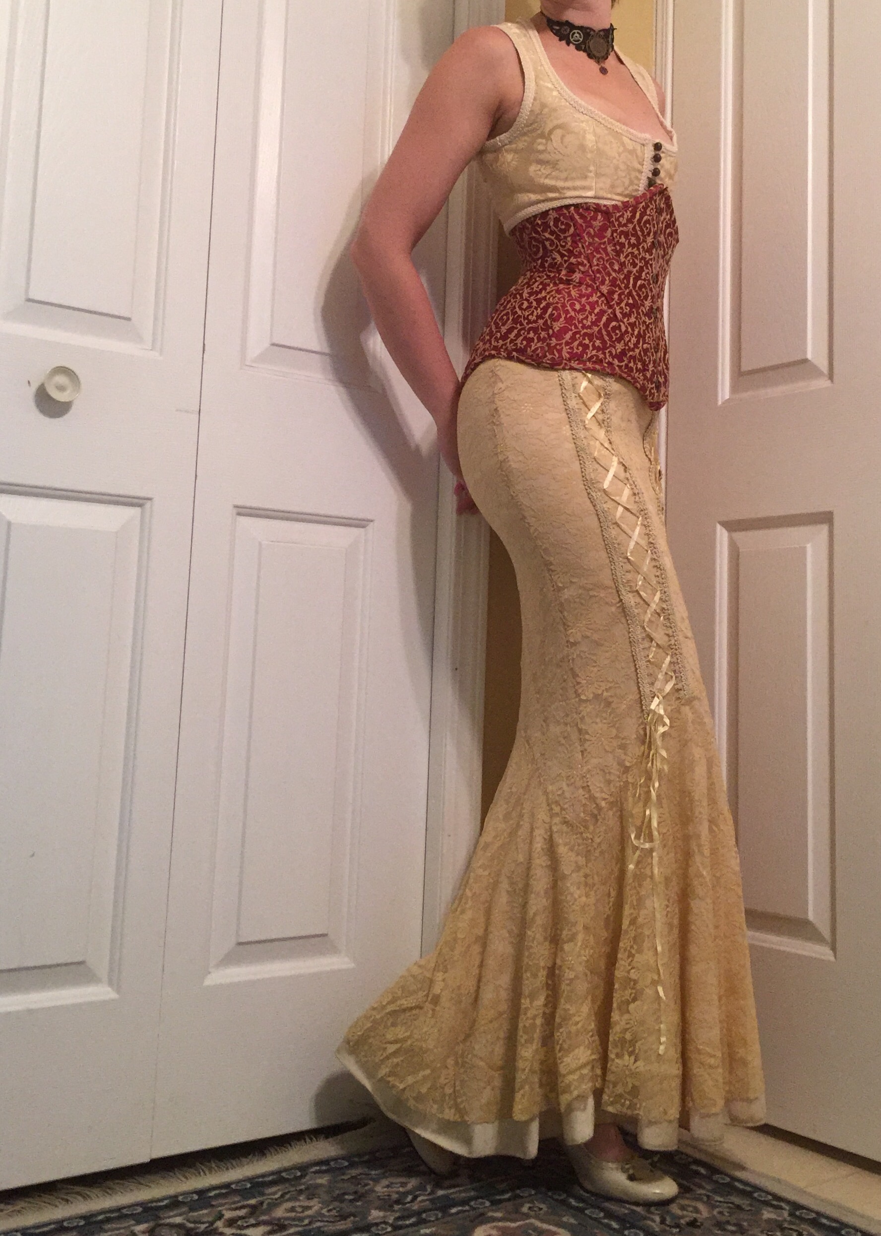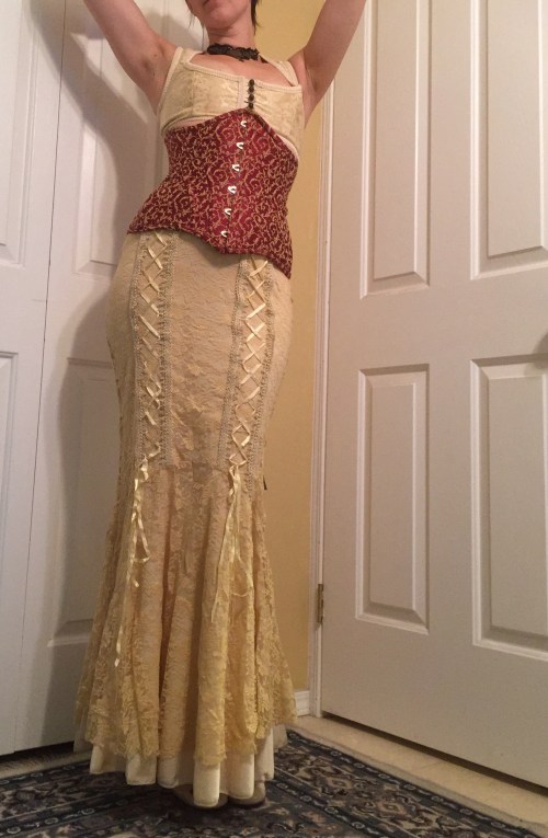 I followed the directions for sizing and cut a 12, and it’s basically perfect. Aside from the added height in front, I did a small swayback adjustment. (If I don’t do those I find the corset makes me slouch—I bend my upper body forward rather than tucking my butt under)—and that’s it. There’s a tiny bit of buckling around the back hip where my hips want to flare out sooner than the pattern does, and a bit of looseness in front where I added at the top, but those are the only quibbles I can come up with for fit, and the one is very specific to my body while the other one is my own doing.