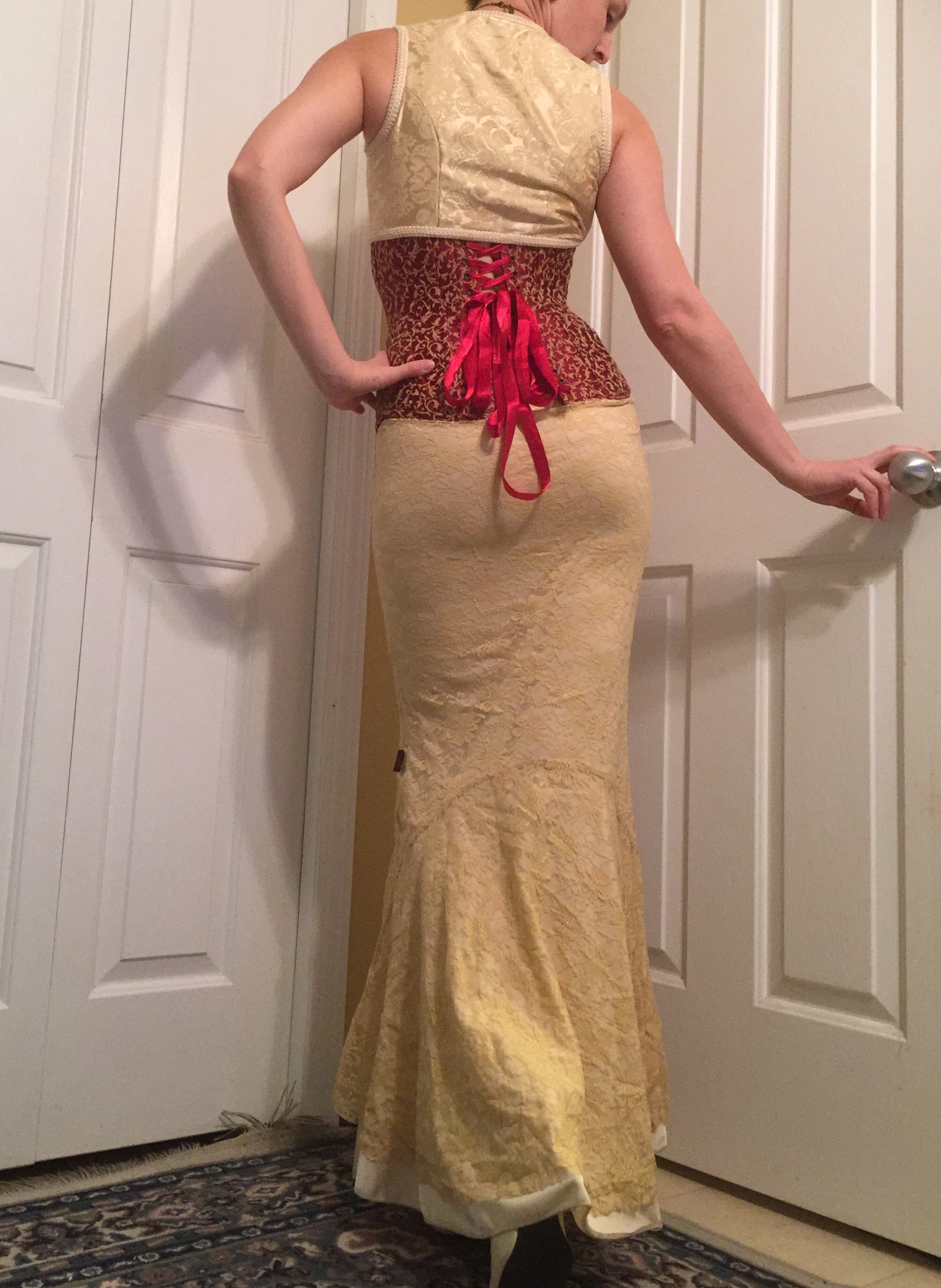 That’s right, no mockup. Just straight to fashion fabric. Keeping in mind I’m pretty sure the brocade was a gift and the strength layer behind is from an old bedsheet I once bought to use as muslin fabric, which is some kind of rocklike poly blend that I think would make sleeping positively perilous, but it’s so sturdy and unforgiving it seemed destined for backing a more-or-less fashion corset. So, um, not a high investment in materials.