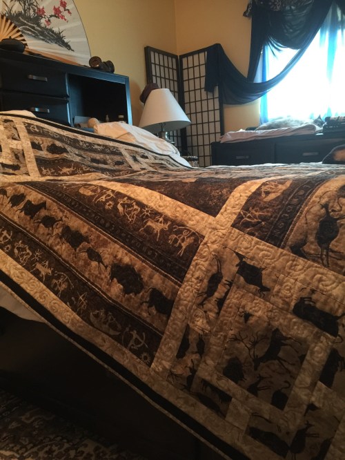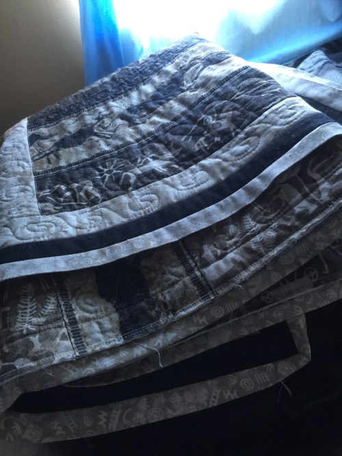 There isn’t much of a reveal here, since it was pretty much all together last post, but the quilt for my dad is finished.