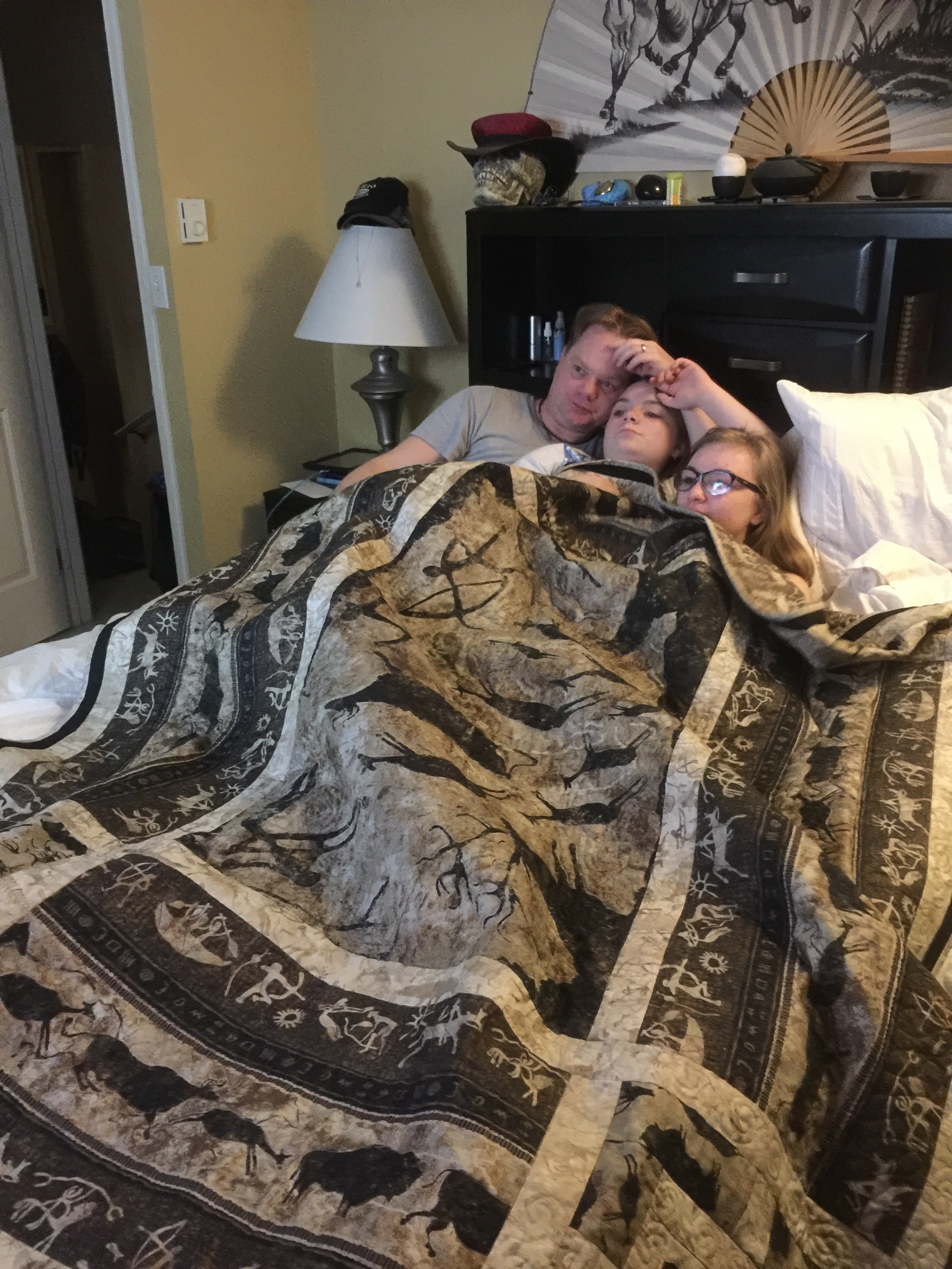 Now it just has to hang at work for three whole months (darn craft projects)—but I will have it back in time for a Father’s Day gift, if I want to go that route. I am debating what to do with my scraps. I could probably squeeze out a pillow-case or two if he does end up using it for his bed, but I was really hoping more for it to be a couch throw. (Y’know, downstairs where I can see it. 😉 ) I could make matching cushion covers for the couch. Or a tote bag for my mom. I really should make something for her… 😂 I’m a bad, bad daughter.