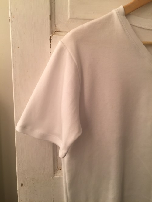 Anyway, while I won’t presume to have done better, I did want to throw my hat in the ring. I had attempted a tee for him before from the Thread Theory Strathcona, but it didn’t fare well—the fabric was wrong, the fit not right, and my attempts to hack a V neck version were either too high or too low. I even ordered some expensive cotton interlock from them to try again with a more “typical” fabric, but was too chicken to cut into $18/m fabric without a more successful trial.