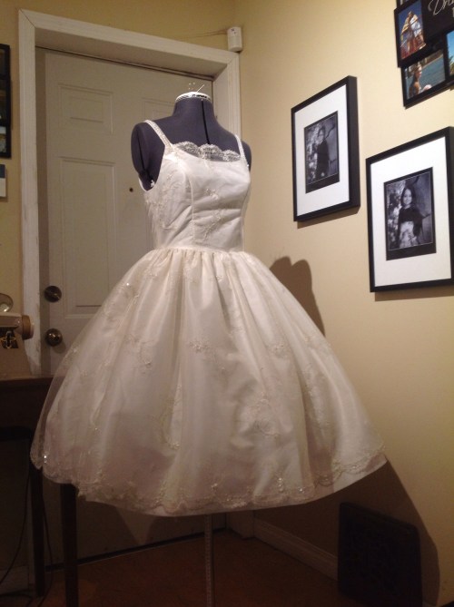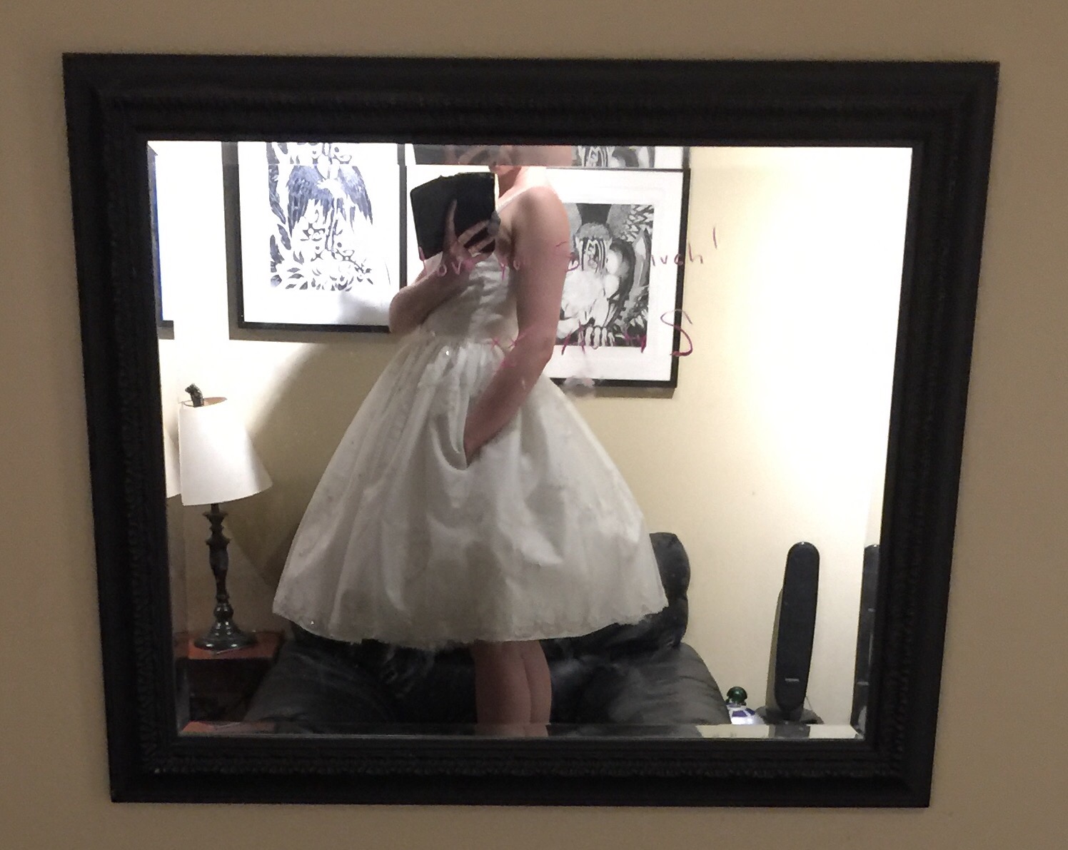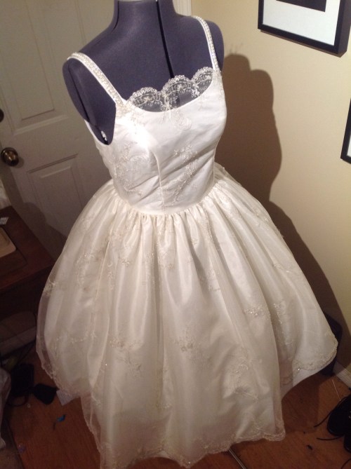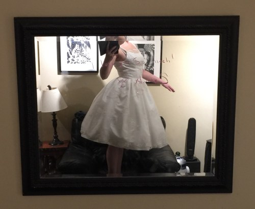 So I don’t think I’ll be mainlining dirndl skirts quite yet, but I did enjoy this project, and I’m curious what I will think if I can manage to get some proper photos. Part of my shift in attitude is a shift in my own body, which is rather more hour-glassy here in the latter half of my 30s than it was in my formative years. But still short-waisted. That part actually gets worse as I put weight on my hips. Anyway, it was a fun exercise. And I am now accepting ideas for what to do with a completely superfluous wedding dress.