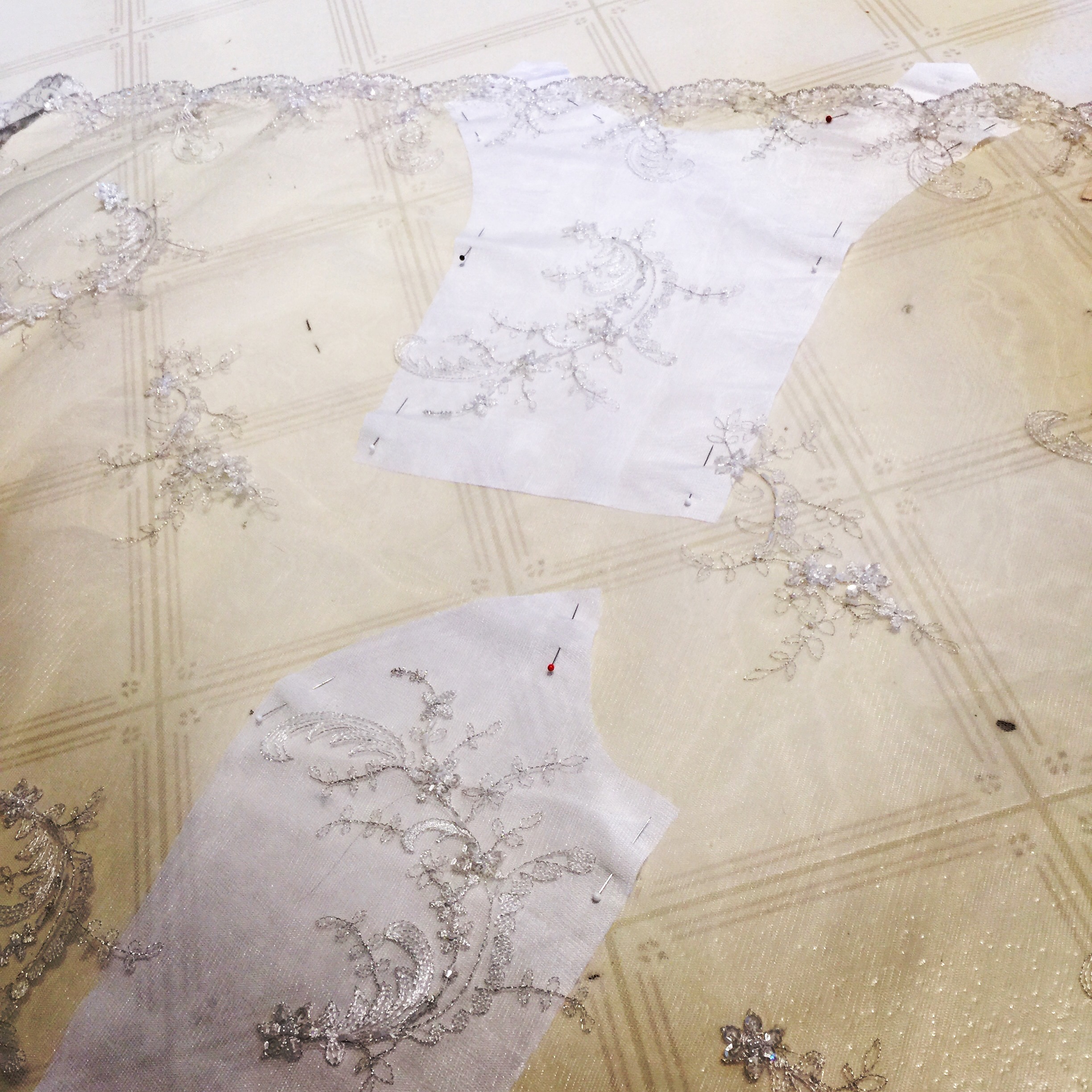 On a side note, this pattern is a total fabric hog, BUT, if you have a double-edged border, as I did on the lace, or are willing to compromise the skirt fullness slightly (as I had to do with the taffeta underlayer, since apparently no one at my store remembered to order more of the white bridal taffeta) it becomes much more manageable.