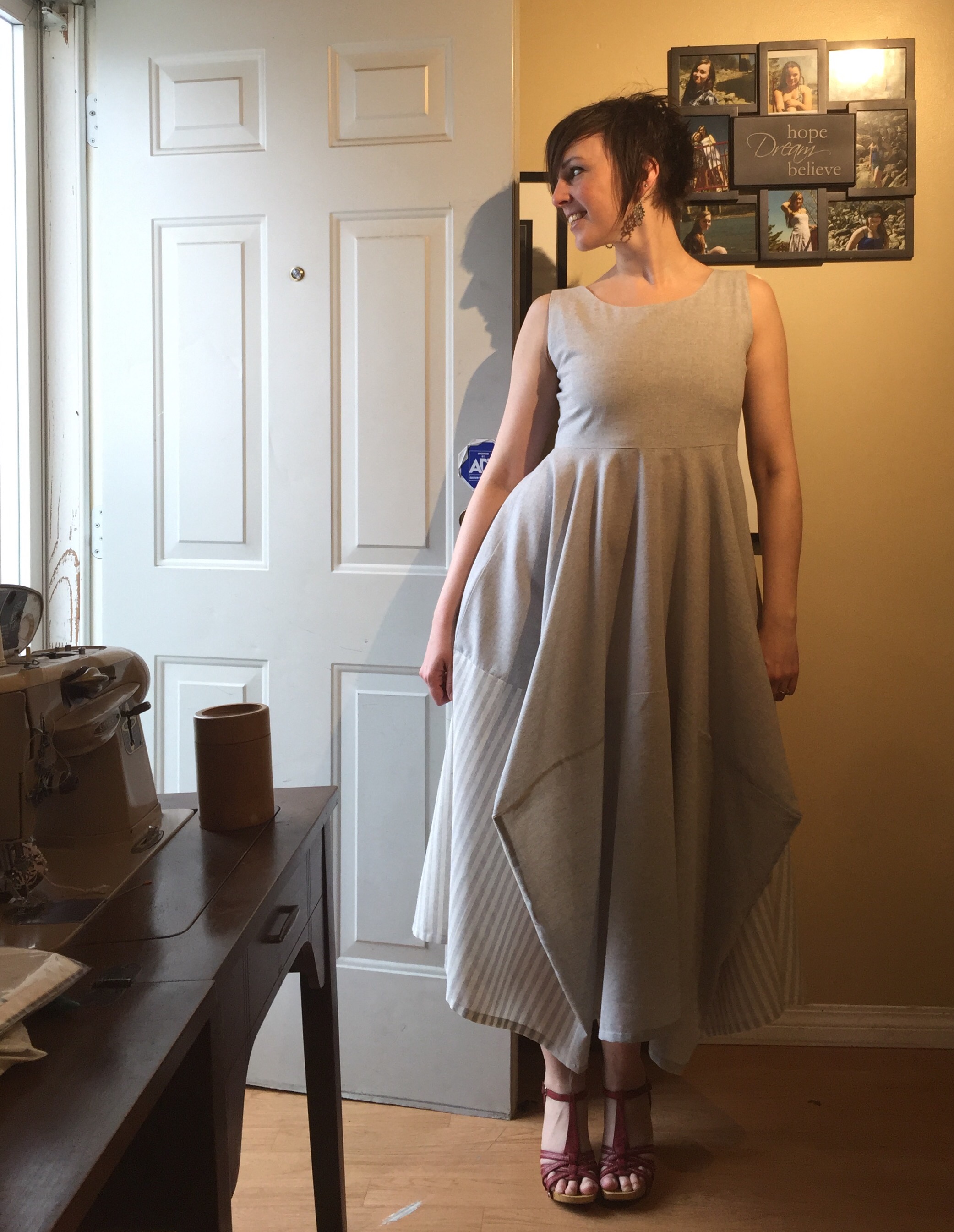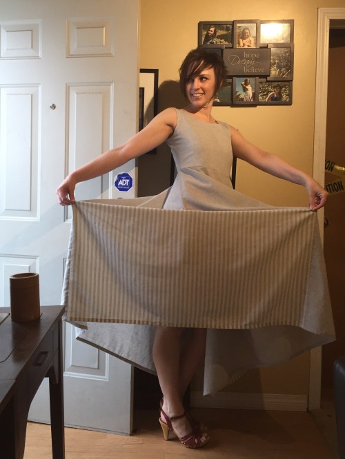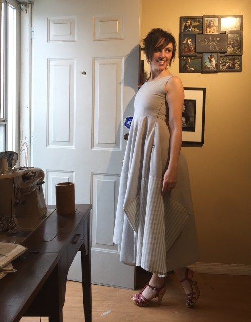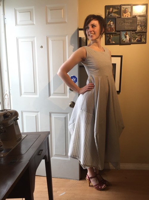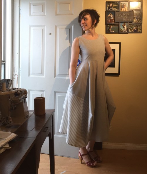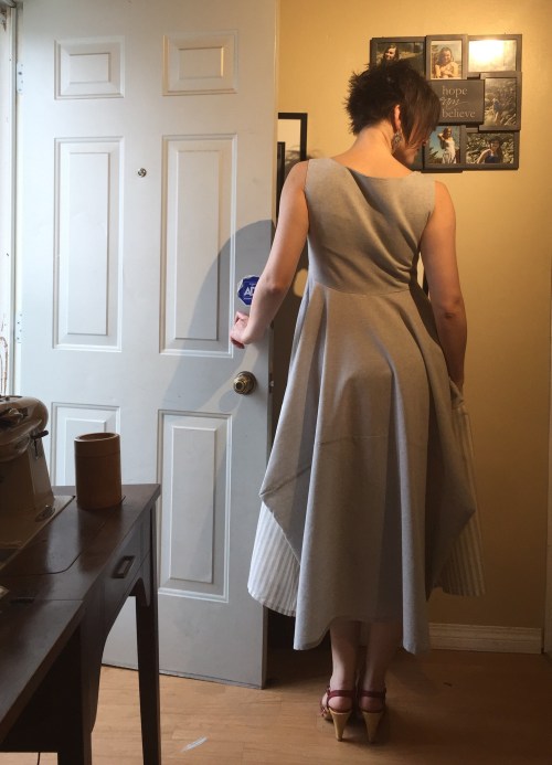 My biggest dumb moment was deciding to put the side zip in upside down, so I wouldn’t have an annoying tab in my armpit all day. Well, the annoying tab is now annoyingly visible down on my hip. So, not a win, really, especially since the zipper is considerably darker grey than the fabric. A white zipper might’ve been better. Also it was a brat to set in—I should’ve used a lot more stabilizer. Someday I’ll learn. I keep saying that.