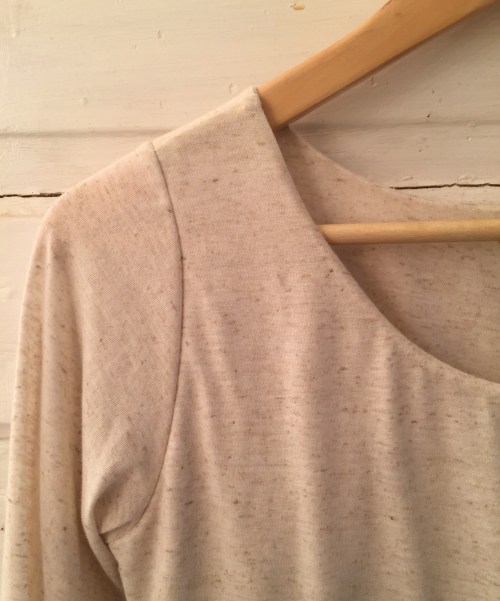 I knew given the thinness of the jersey that I wanted to self-line the bodice. To give the neck a clean finish I sewed up the shoulders and then sewed the necklines together in a circle, stabilizing with 1/4″ clear elastic. I love 1/4″ clear elastic. I flipped the pieces so the wrong sides are together and the stitching and elastic was hidden between the two layers, then I basted the edges so the two layers would stay together and constructed the rest like a regular unlined T-shirt. There was a bit more ease in the sleeve cap than I like in a knit, but not much, and I did get them in without much difficulty, so I can’t really complain. Once I had the bodice put together I did take in the side seams and upper parts of the sleeve about 1.5cm on each seam, to snug it up a bit in my no-spandex poor recovery fabric.