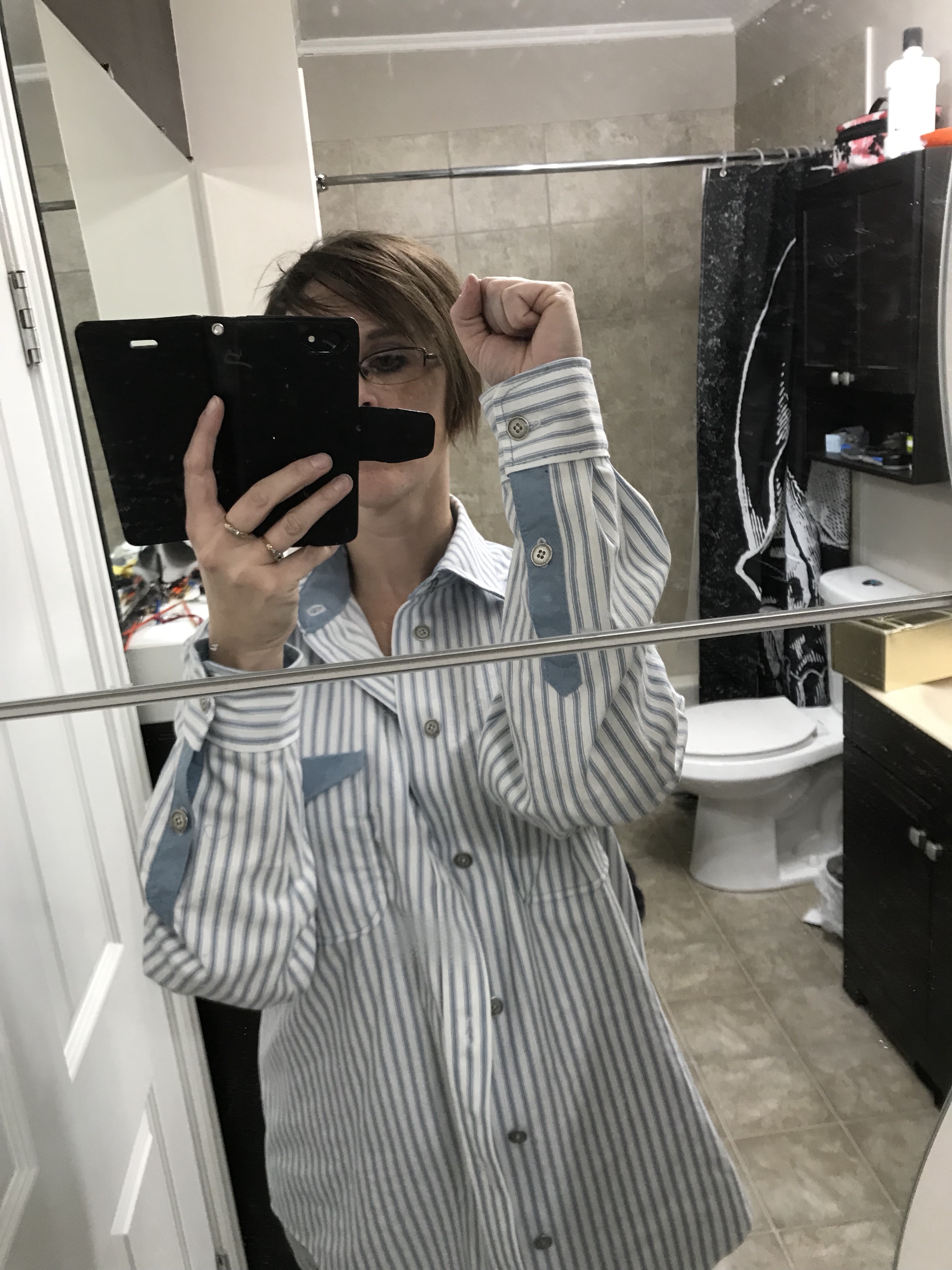 I don’t feel like this is a crowning example of shirt making. My stitching isn’t quite as precise as I’d like, and the soft twill liked to shift around. I topstitched some of it at about 1/4″ and some is edge stitched and I like the edgestitch better, but not enough to go back and redo it all. I used three machines in construction, not counting the serger, which I only used to finish the armscye since I’m too lazy to flat-fell. I used my usual Janome for the main construction, with walking foot to facilitate stripe matching on the collar and back yoke. I used my grandmother’s old Rocketeer for the buttonholes. And I used a 70s-era Elna a friend gave me last summer for the top stitching, since it has a speed control, which is pretty much my favourite thing for top stitching ever.