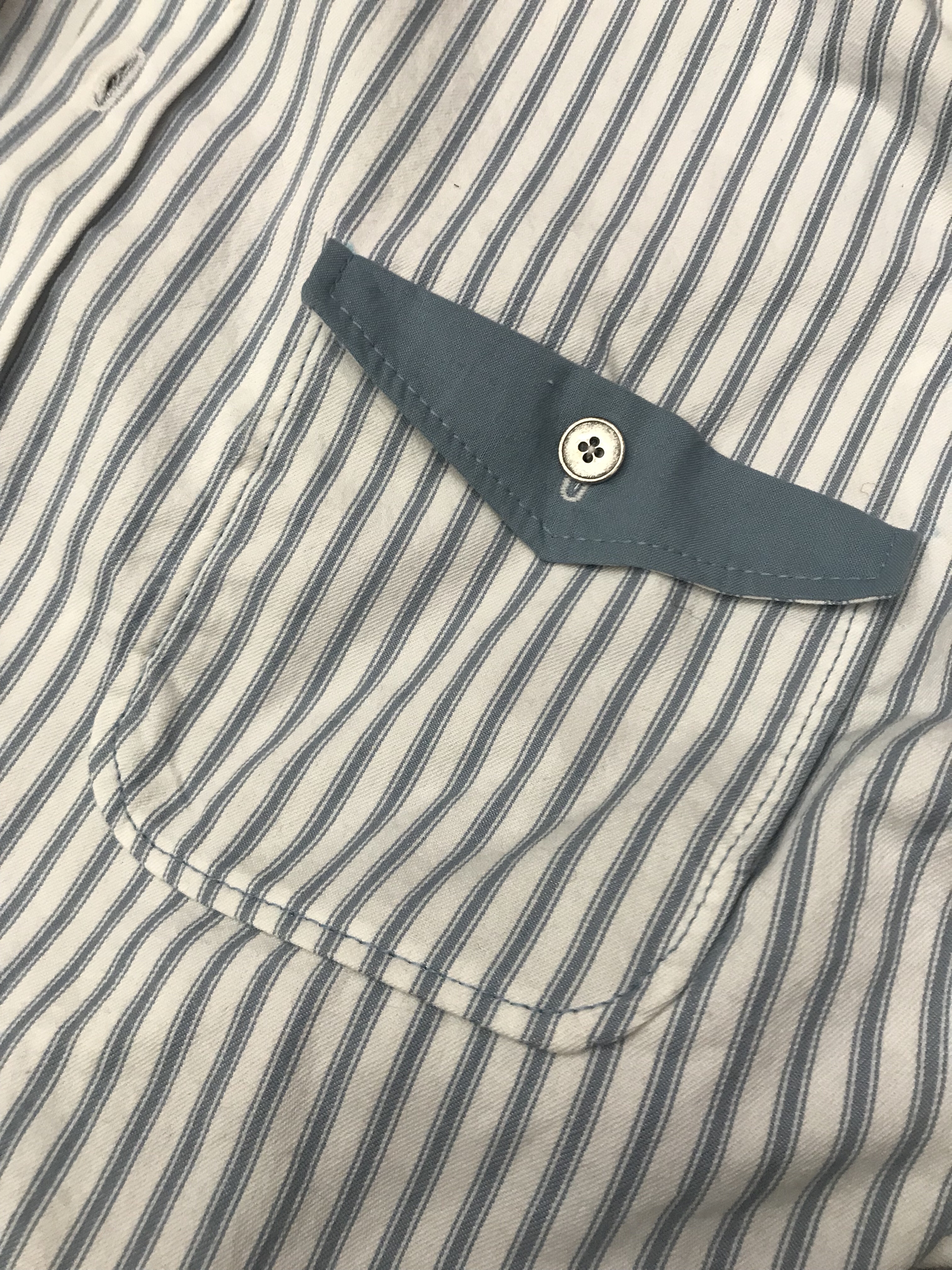 For a pattern, since I was doing this as a shop project, I went with McCall’s 2447, in all its dated glory. I didn’t want a super-fitted or overly fussy pattern, and it actually seems fairly nicely drafted. It has a proper grain-elevator placket for the sleeve, a neat pocket detail, separate button band, and the collar isn’t as huge as I had feared. I checked the finished measurements and opted to make a medium rather than a large, because it’s hugely oversized. I’ve added 2″ to the sleeve length, which will hopefully be enough. I also made a cut-on button band rather than going with the separate route, because I was worried about stripe issues, but I like the option of the separate band for contrast and detail purposes.