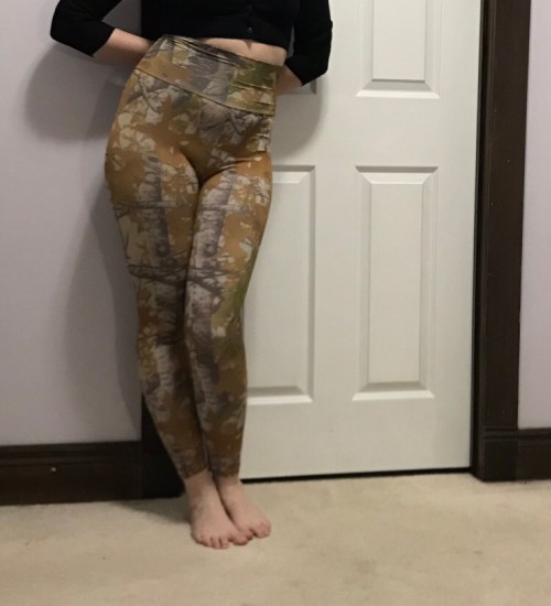 I like your new leggings A LOT! The print looks like the eco-dyeing I see these days. A very interesting print. They fit you beautifully. They look great. If the colour doesn’t go with anything else in your wardrobe would you consider dyeing them?