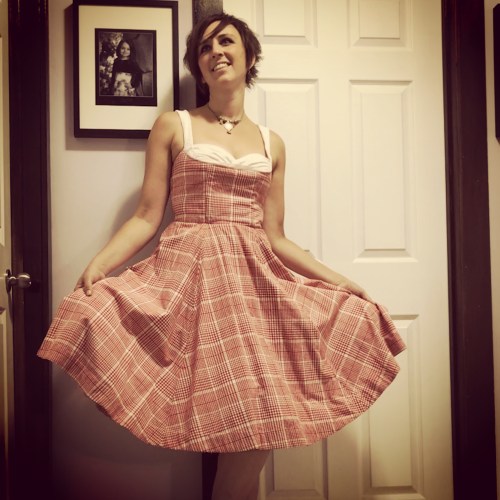Next is its effect on what I wear. Shortly after I started working at Fabricland, the simple good marketing of wearing things I had made became obvious—but not just anything. The jeans and tees that had dominated a lot of my sewing while I was in grad school, trying to disappear into the background, don’t make anyone ask “Did you make that?” The dresses did. Those same ones I was conveniently making for impractical but fun projects. And I’ve always been one for binges of overdressing, so a perfect storm was created. I was making crazy dresses. I was wearing crazy dresses. I had a REASON to wear crazy dresses. This week, without that reason, I haven’t quite reverted to form, but it’s felt different. My day job doesn’t have much of a dress code and doesn’t directly interface with the public, so that drive is missing. On the other hand, there are several of us who enjoy playing with our wardrobes, so I don’t think the dresses are suddenly going to languish. But I may not make quite as many of them.