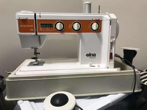 I have been doing all my topstitching lately on an old (80s) Elna a friend gave me. It doesn’t blink at topstitching thread (except with this stretchy fabric) but more importantly it’s got this weird air-bubble foot pedal that gives amazing control—the best I’ve had in a non-computerized machine—and an adjustable speed that goes from painfully slow (perfect for topstitching) to so fast you have to adjust the tension because the thread is getting pulled so quickly (perfect for topstitching with a triple stitch, which seems painfully slow otherwise)