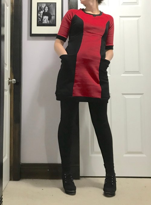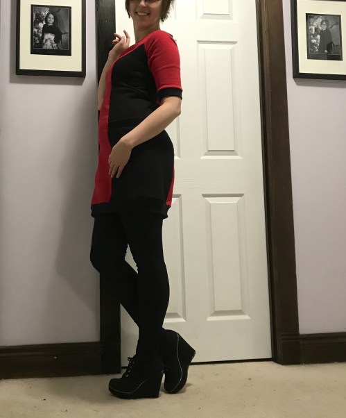 On the whole I’m pretty happy, especially with the pockets. The only problem is, my children have informed me that the red-and-black colourblocking makes me look like an employee at Sephora. The other option is a Star Trek reference, which I gotta say I prefer. The key point is that this dress brings my sweater-dress count up to five, which means, if I so desired, I could do an entire week of sweater-dresses.